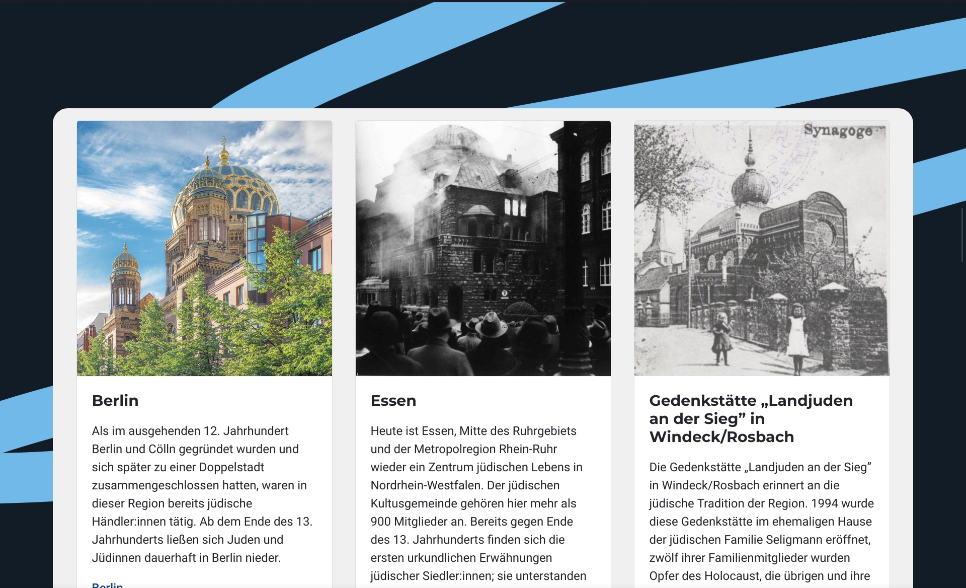 Für 1943 haben wir überraschender Weise lediglich zwei Register zur Auswahl, und beide bringen uns an keinen der sieben Ort. Dafür jedoch stehen uns u.a. Informationen zum ersten Transport Thessalonikischer Juden nach Auschwitz zur Verfügung. Denn wir haben zugleich den Haupt-Zeitstrahl verlassen, der uns ja zu einem der sieben Orte bringt und sortieren uns nun neuerlich unter der Rubrik „Partner“ ein – also internationale Kooperationen, die uns über den deutschen Raum hinausführen. D.h. beim Hoch- oder Runterscrollen finden wir uns nicht wieder in der Hauptausstellung ein, sondern hangeln uns entlang Informationen zu Projekten im Zusammenhang mit jüdischem Leben und Erinnerungskultur. Das ist verwirrend, wirkt teilweise wahllos. Ein klassischer Fehler den virtuellen Raum als multidimensional zu begreifen, gleichzeitig jedoch als klassischen White Cube zu nutzen. Farbskalen würden hier schon helfen zu veranschaulichen, dass wir uns in einer neuen Rubrik befinden. Diese hätte ich im Übrigen auch für jeden der sieben Ort angewendet. Aus Pietät wurde wohl von einer reichen Farbwahl abgesehen und kontinuierlich auf gedecktes Schwarz und Blau gesetzt.