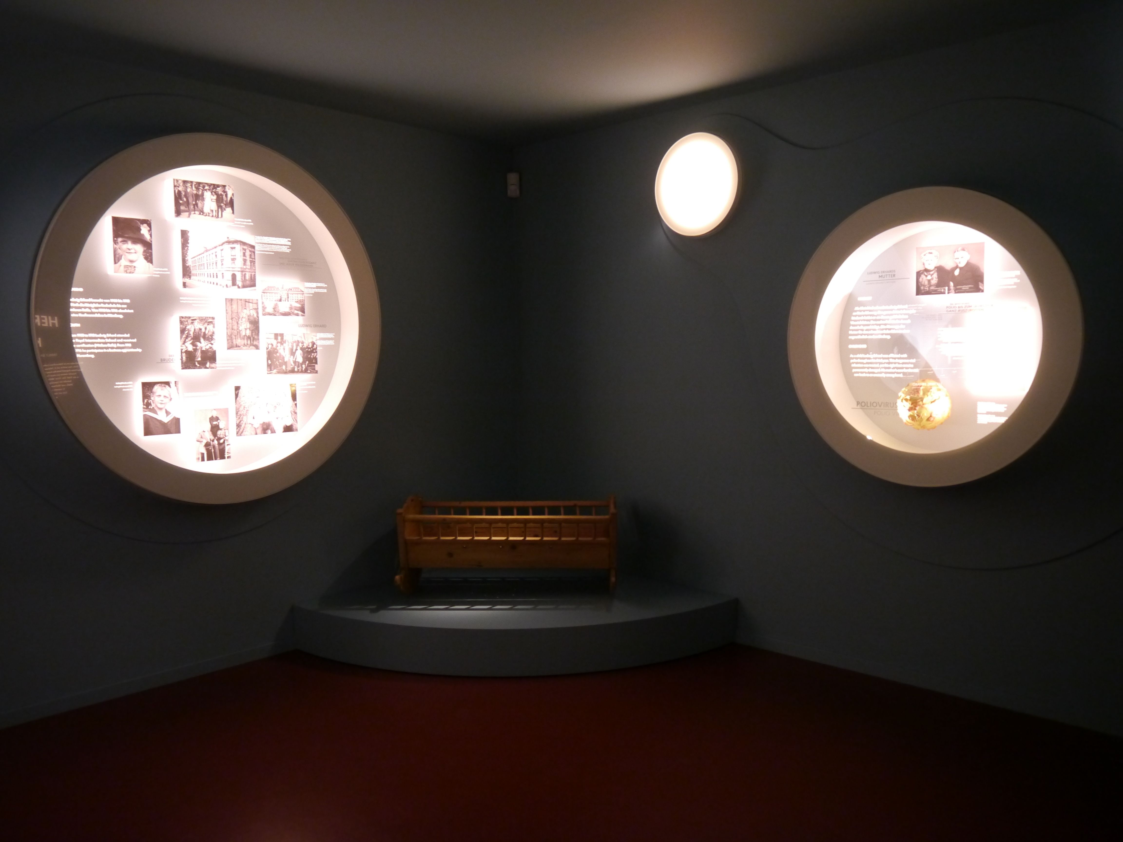 Magdalena Beyrich: Die Beleuchtung wird durch runde Vitrinen gesteuert, in denen schwarz-weiß Bilder der Familie Erhard von hinten angeleuchtet werden. Die blaue Farbe und die runden Formen lassen in mir ein Gefühl von Geborgenheit aufsteigen. Eine Holzwiege ist das einzige haptische Objekt im Raum. Sie ist kein Originalobjekt und besitzt keine Beschriftung. Sie gilt als Symbol: „Die Wiege der sozialen Marktwirtschaft“. Es wird deutlich, dass alle weiteren Geschehnisse auf die Kindheit, also auf Erhard selbst, aufbauen und er am Ende als die Wiege der sozialen Marktwirtschaft steht.