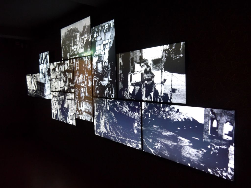 M.B.: Im dunkel gehaltenen, letzten Raum der Ausstellung „Die Wiege der sozialen Marktwirtschaft“ befinden sich similär zu oben auch einige Bildschirme an der rechten Wand. Sie zeigen dieses Mal verzweifelte Menschen, zerstörte Städte, das Ankommen der Amerikaner, das Wegräumen der Waffen und die Sprengung des Hakenkreuzes. Gegenüber den Bildschirmen befindet sich eine Sitzgelegenheit.