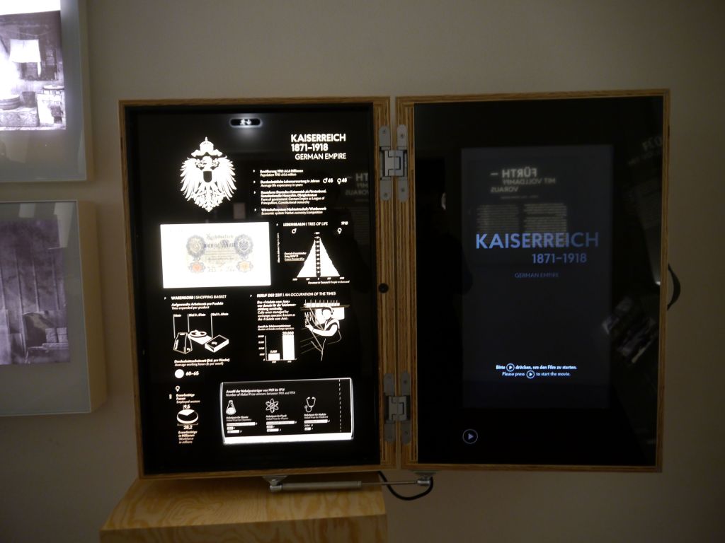 A.E.: Im zweiten Raum geht es um das Weißwarengeschäft der Erhards und die allgemeine Wirtschaftslage in Fürth. Ein Stapel Kisten aus hellem Holz an der hinteren Wand weckt mein Interesse. Die oberste ist aufgestellt und wie ein Koffer geöffnet. Eine glänzend-schwarze Texttafel informiert umfangreich über die Zeit des Kaiserreiches von 1871 – 1918. Eine drehbare Walze zeigt einen Zeitstrahl mit historischen Ereignissen, wie z.B. die Reichsgründung 1871. Spannender ist die rechte Seite des Koffers. Dort befindet sich ein Bildschirm, auf dem per Knopfdruck ein Kurzfilm abgespielt werden kann. Inhaltlich sieht man den Fürther Komödianten Volker Heißmann mit Kaiserbart, der von den ärmlichen Verhältnissen der Bevölkerung in der Kaiserzeit erzählt. Eine durchaus gewagte Besetzung, für eine derart ernste Thematik. Als Besucherin begrüße ich jedoch diese komödiantische Darstellung, die das Thema zum einen interessanter mach und etwas auflockert und zum anderen einen lokalen Bezug zur Stadt Fürth herstellt.