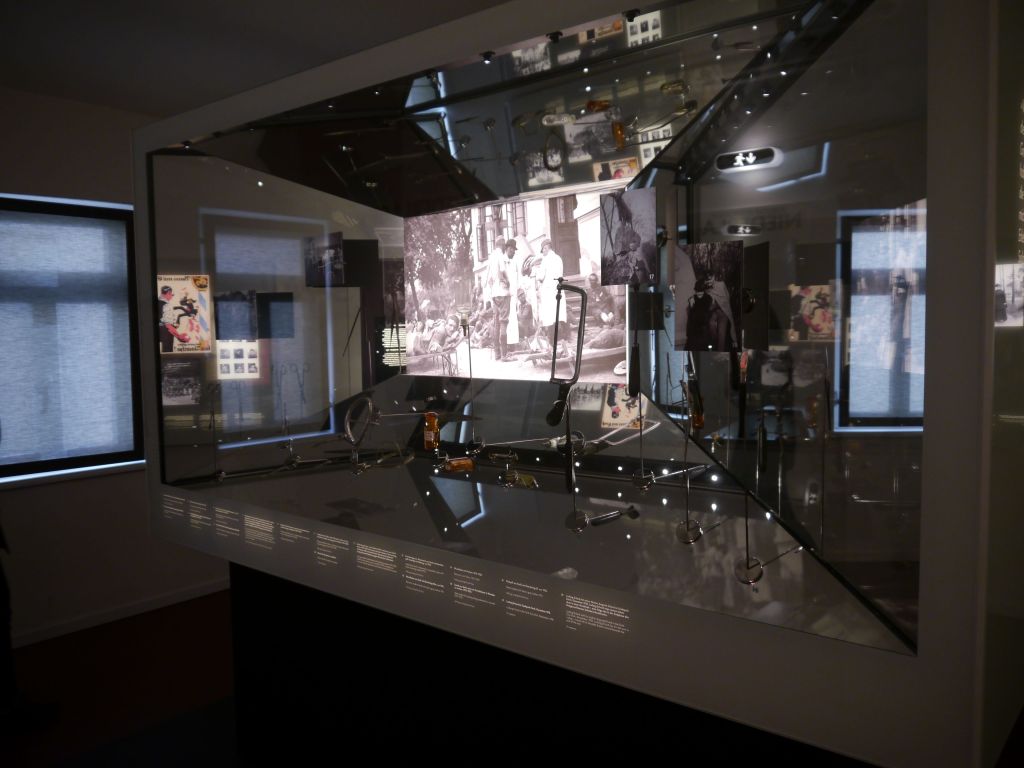 M.B.: Der nächste Raum, in dem es um Erhards Rolle im Krieg geht, ist wiederum hell gestaltet. Der erste Blick fällt auf eine große Spiegelvitrine, die mittig im Raum platziert ist. Hier werden medizinische Instrumente ästhetisch dargestellt, sowie mögliche Kriegswunden und wie diese behandelt wurden. Der Raum stellt dar, warum Erhard sich entschied, in den Krieg zu ziehen. Es werden die positiven Seiten des Kriegseintritts hervorgehoben, aber es findet auch eine Darstellung von Niederlagen und Wunden statt. In diesem Raum liegt das Augenmerk wieder auf Ludwig Erhard selbst. Das Handeln Erhards wird in einem großen Gesamtgefüge vermittelt und erhält dadurch im einzelnen weniger Gewicht und Widerstand.