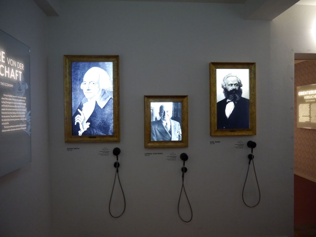 M.B.: Der erste Ausstellungsraum im 1. Obergeschoss thematisiert das Wirtschaftswissen. Hier stehe ich vor verschiedenen Gemälden mit Größen der Wirtschaft, wie Karl Marx und Adam Smith. Ich kann mich über Hörer, die an jedem Gemälde angebracht sind, über ihre Wirtschaftstheorien aufklären lassen. Das Besondere hierbei ist, dass ich scheinbar mit der Person ein Gespräch führe, da sich die Augen und Lippen mitbewege. Simultan zum zweiten Stock, sind nun anstatt seiner Familie, diese Personen seine Vorbilder, Vorreiter und Wegweiser.