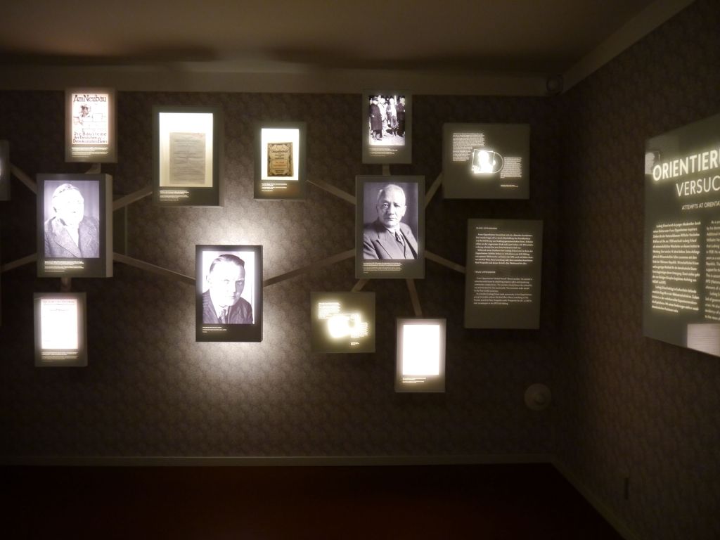 A.E.: Der nächste Raum fällt vor allem durch seine Farbgebung auf. Vor den grünen Wänden stehen rote Sockel für Vitrinen und Texte. Thematisiert werden die „Überlegungen für die Nachkriegszeit“. Die Komplementärfarben illustrieren womöglich den Zwiespalt zwischen der Hoffnung auf einen wirtschaftlichen Neuanfang und der nationalsozialistischen Befangenheit vieler Ökonomen.