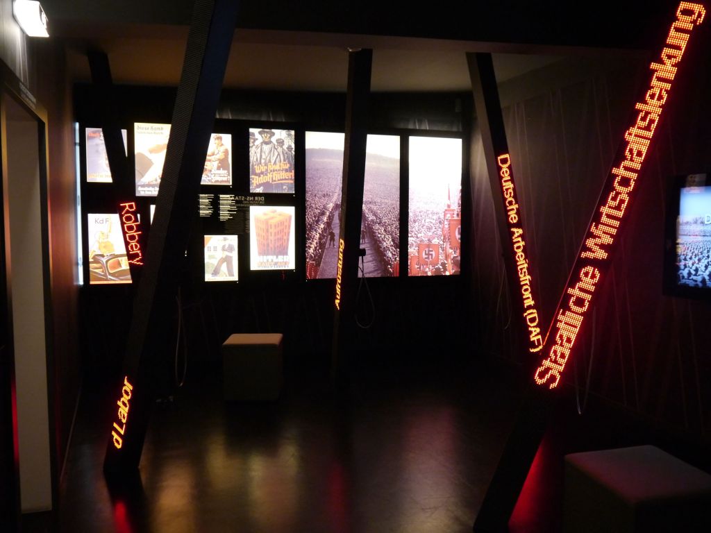 A.E.: Architektonisch ist der darauffolgende Raum sehr interessant. Auf schiefen Pfeilern angebrachte LED-Matten verkünden Schlagwörter wie „Deutsche Arbeitsfront“ oder „staatliche Wirtschaftslenkung“ in roten Leuchtbuchstaben, die in dem dunklen Raum grell und aggressiv wirken. Die schrägen Pfeiler finden sich auf der Tapete wieder, durch die der Raum wie ein Gefängnis wirkt. Der Deutsche gefangen im eigenen Land?