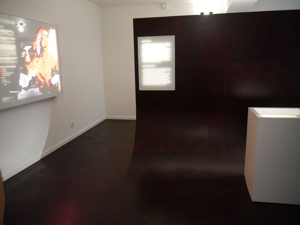 M.B.: So wie im 2. Obergeschoss auch, wirkt der 3. Ausstellungsraum erneut dunkel und geheimnisvoll. Der Raum ist zusätzlich mit schrägen Balken, an denen Audiostationen angebracht sind, und Sitzgelegenheiten ausgestattet. Der Fokus fällt wieder zuerst auf ein Video, das vom NS-Regime zu Propagandazwecken erzeugt wurde. Das museale Konzept stützt sich hier auf eine Verbindung von architektonischen Elementen mit Texten und Illustrationen. Diese lenken die Rezeption und die Wahrnehmung in eine bestimmte Richtung, sie wecken Neugier, aber lassen auch vor der Grausamkeit zurückschrecken.