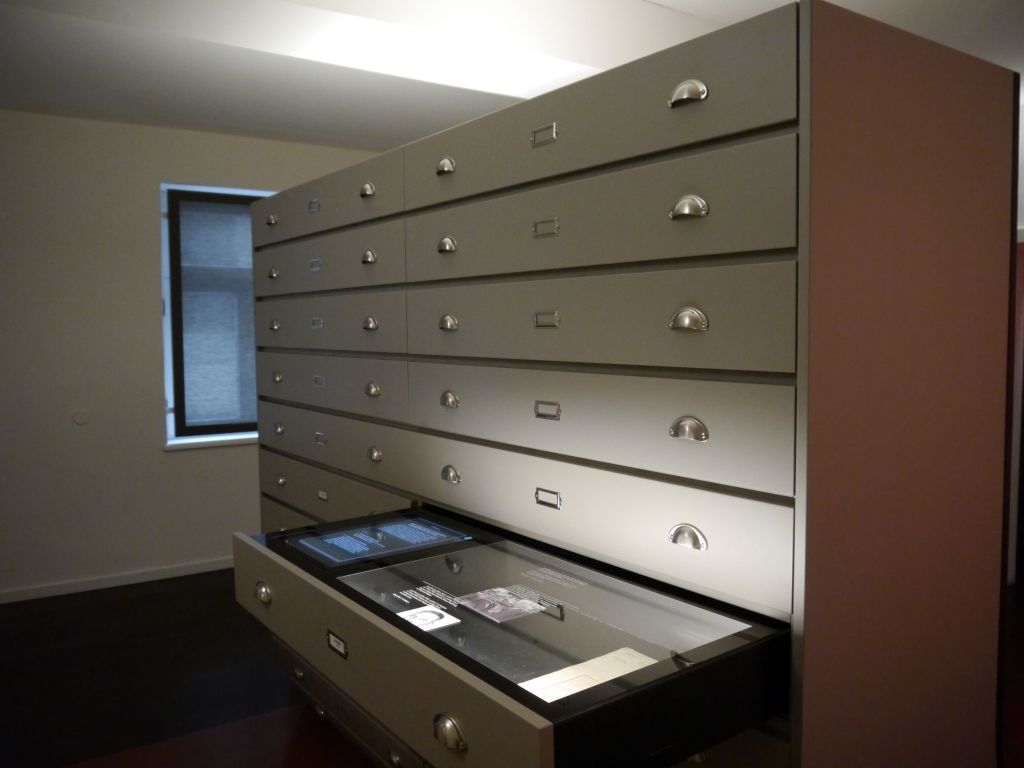 M.B.: Dieser Raum ist wieder hell gehalten. Anstatt einer großen Spiegelvitrine ist hier ein enormer Aktenschrank inmitten des Raumes vorzufinden. Dieses Mal ist Ludwig Erhard als Wirtschaftsberater im 2. Weltkrieg zuständig und nicht als Soldat. Der Unterschied zum 2. Stock ist, dass der Krieg nicht mehr als etwas Positives gesehen und der Raum dadurch schlicht gehalten wird.