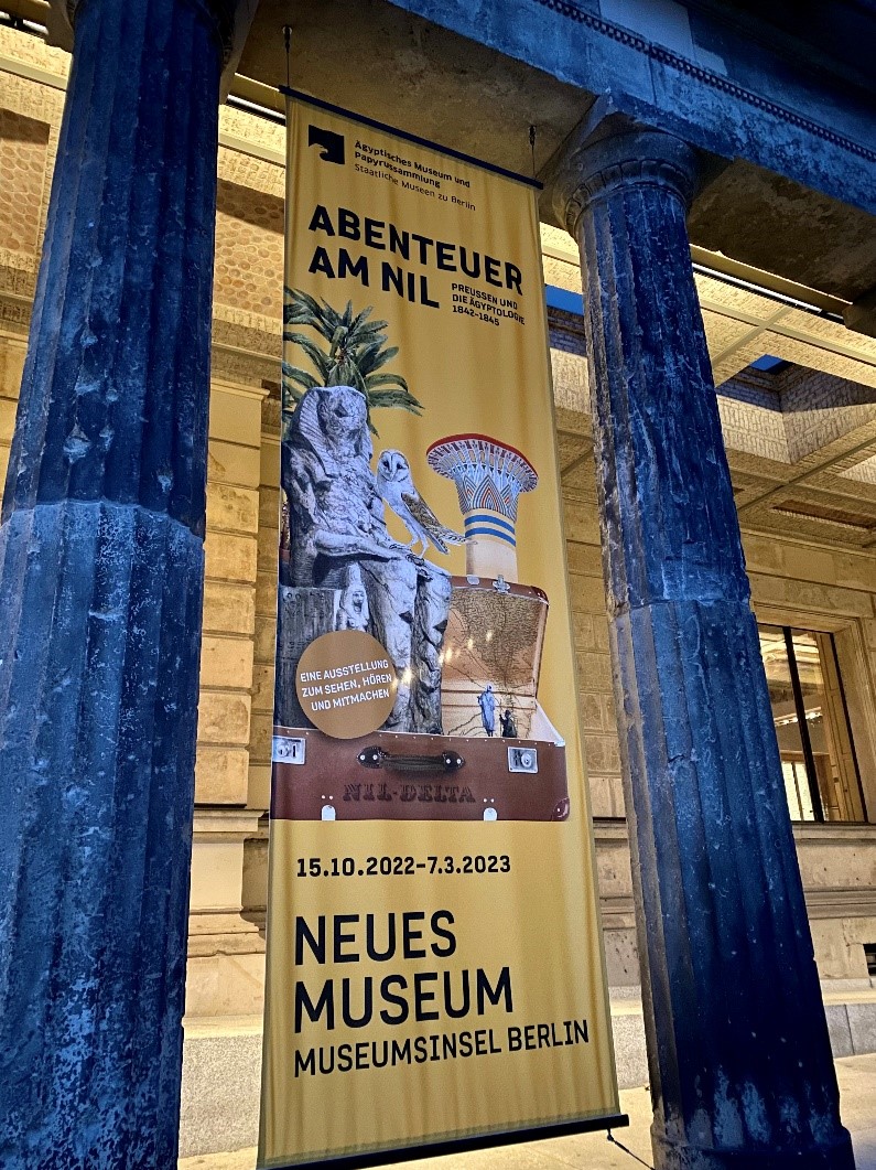 Aufmerksam auf die Ausstellung Abenteuer am Nil – Preussen und die Ägyptologie 1842-1854 wurde ich durch die Werbefahne vor dem Eingang des Neuen Museums auf der Berliner Museumsinsel, welche mir eine Ausstellung zum Mitmachen versprach. Auch die Begrüßungstafel im ersten Raum des Untergeschosses, greift die Sinne, die folgend angesprochen werden, auf. Retrospektiv verspricht sie mit der Möglichkeit, selbst Hand anlegen zu können, etwas zu viel, leitet die Ausstellung vor dessen Beginn jedoch freundlich ein. Der Ausstellungsrundgang ist anhand von Kapiteln und der Nummerierung der Audio-Sequenzen gut ausgeschildert und erschließt sich einem so überwiegend. Die Übersichtlichkeit und Ausschilderung gelingt hier besser als in vielen anderen Ausstellungen in historischen Gebäuden auf der Museumsinsel. Es gibt in dem Ausstellungsrundgang aufgrund der Vielzahl an Objekten und zugehörigen Texten die Möglichkeit, sich Themen länger zu widmen und bei diesen zu verweilen. Auch da die Ausstellung zum Teil in Fusion mit der Dauerausstellung und dessen Objekten aufgebaut ist, wird die Wichtigkeit der Funde betont. Die Ausstellungsinhalte sind übergreifend orange farblich gekennzeichnet, sodass man dem roten Faden auch in den Dauerausstellungsräumen weiter folgen kann.
