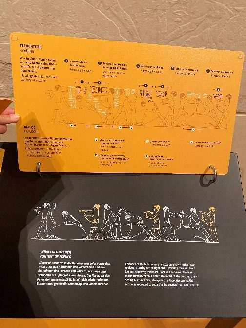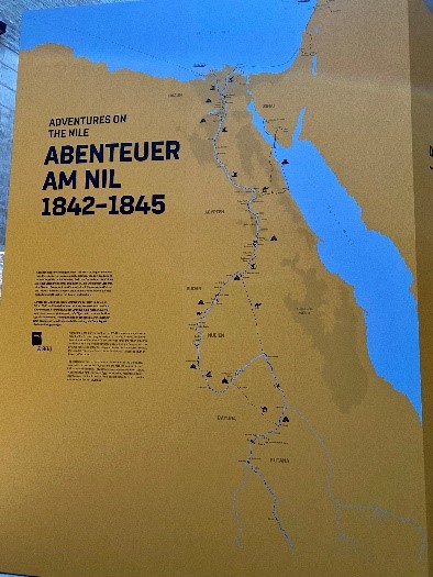 Anschaulich, wenn auch sehr detailliert, werden die Anfänge der preußischen Ägyptologie auf einem großen Schaubild gezeigt und erklärt. Das Thema der Ausstellung – die vom preußischen König Friedrich Wilhelm IV. finanzierte Nilreise – wird damit von Beginn an einem wissenschaftlichen Kontext zugeordnet und ihre Relevanz für die Forschung verdeutlicht. Szenographisch muss angemerkt werden, dass sich dieses Schaubild zum Zeitpunkt meines Besuches (16.20 Uhr Anfang November), aufgrund fehlenden Lichts jedoch nicht sehr gut lesen lässt. Falls es sich hierbei um eine Maßnahme zum Stromsparen handeln sollte, wäre ein Hinweis darauf nützlich. Abgesehen davon gelingen die Kontextualisierungen zur Einführung in die Ausstellung jedoch sehr gut. Auch eine großformatige Karte, die die Reiseroute entlang des Nils durch Ägypten, den Sudan, Nubien und die Bayuda-Wüste zeigt, holt Besucher*innen mit unterschiedlichem geographischem Vorwissen visuell ab.