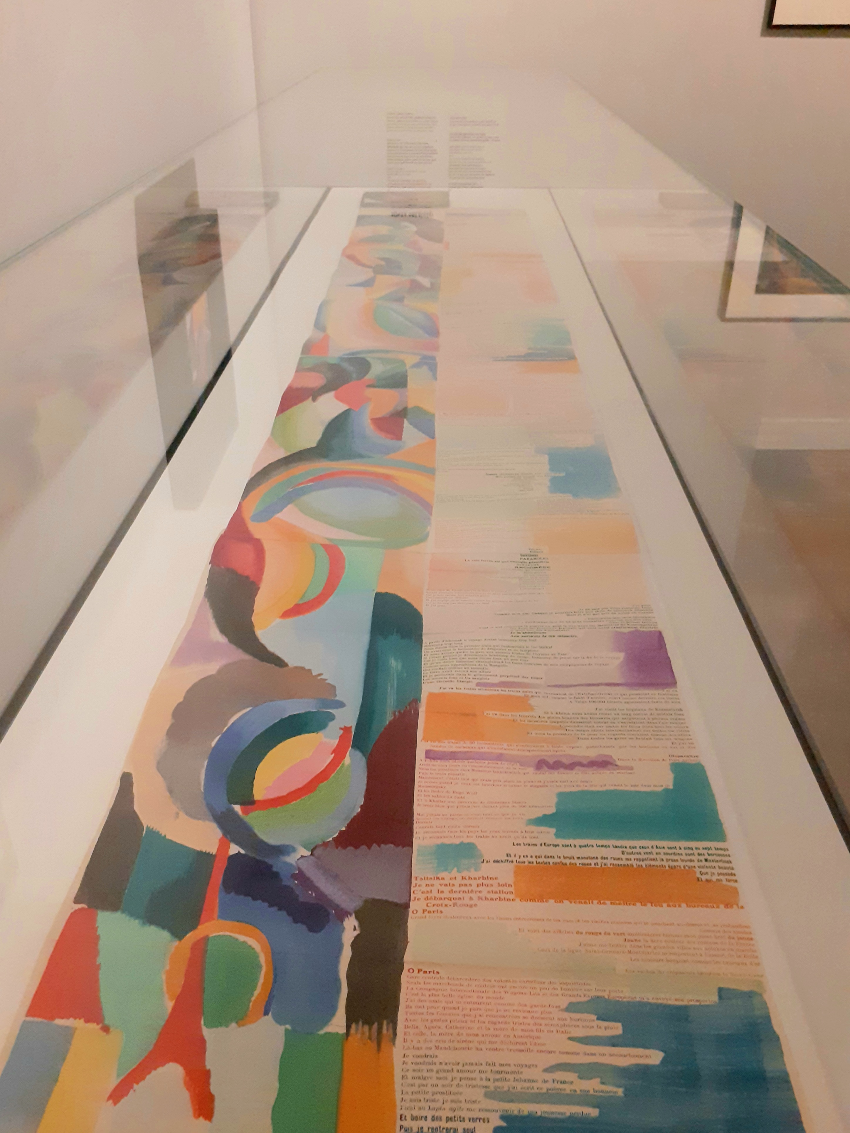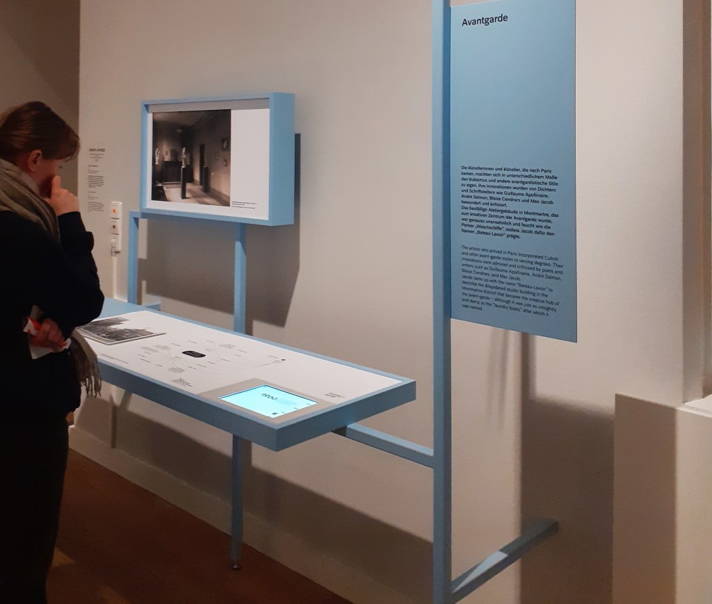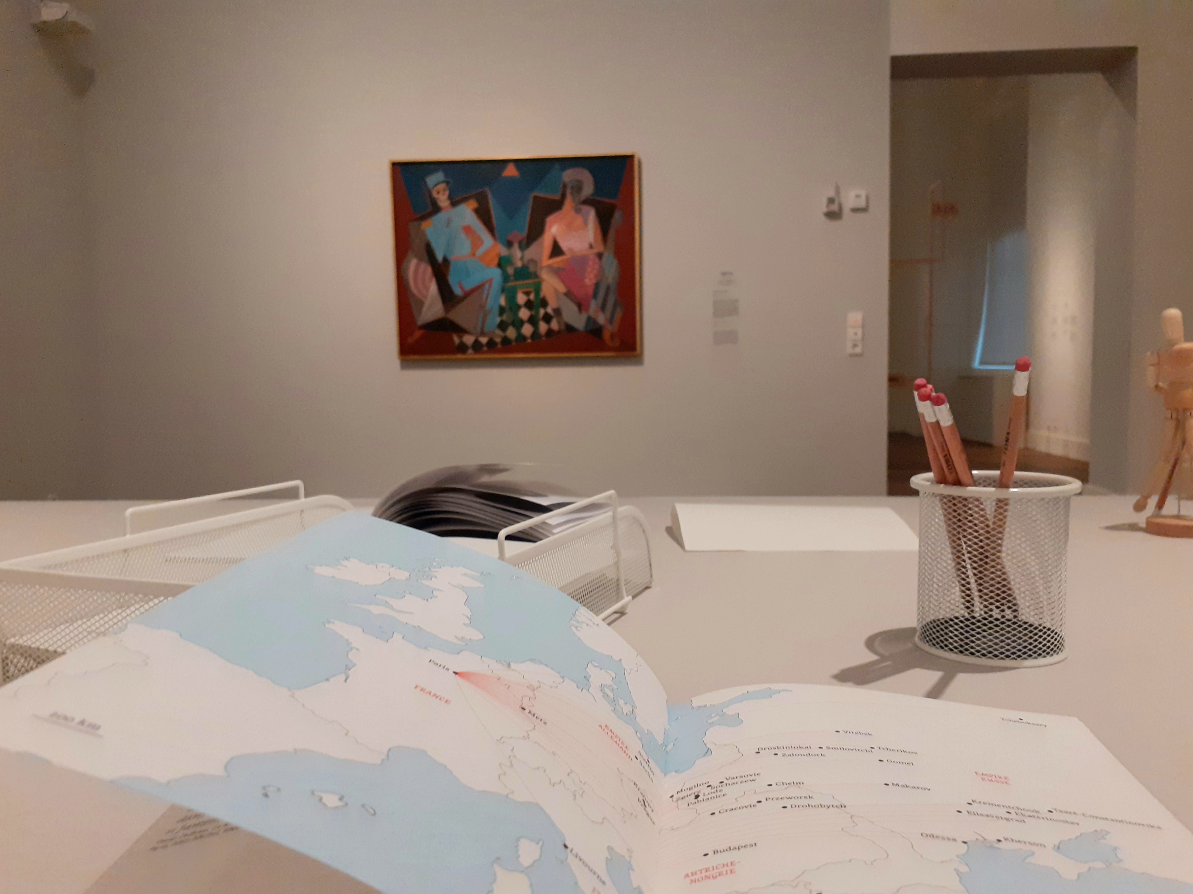 Der Platz im großzügigen Raum davor bleibt hingegen fast ungenutzt, steht in ihm doch lediglich ein großer Tisch, der zur Interaktion einladen soll. An zwei Wänden prangen groß eine Chronologie sowie eine stilisierte Stadtkarte des artistic Paris. Und doch wirkt dieser Bereich behelfsmäßig. Fast schon brüsk ist an der verbliebenen freien Wand das berührend-schockierende Gemälde „La Mort et la Femme“ von Marevna isoliert angebracht, es wirkt etwas deplatziert und kann auch nicht recht als Vermittler zum nachfolgenden Raum betrachtet werden.