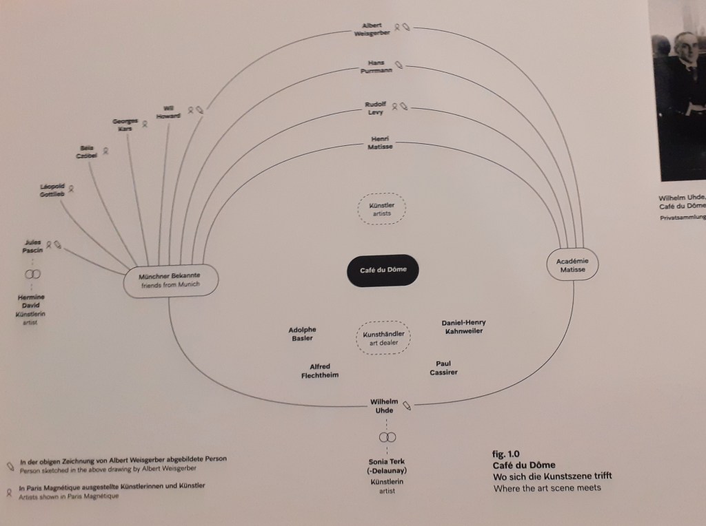 Eine geschicktere Berücksichtigung des Raums und seiner Möglichkeiten hätte interessante Potenziale geboten. Die anschaulich gestalteten Graphiken, welche die verworrenen persönlichen und räumlichen Beziehungsgeflechte visualisieren, hätten deutlich großer ausfallen können. Groß an der Wand platziert hätten sie Signale setzen können und die Lesbarkeit erleichtert. Auch ein interaktiver Gebrauch wäre denkbar, so wie die uns auf Tabletts durch die Ausstellung begleitende Chronologie, die in der Mitte der Ausstellung als großes Wandbild auftaucht. Ebenfalls Mut zur Größe hätte der Umgang mit den fabelhaften fotografischen Zeitdokumenten verdient, die ich mir als groß aufgezogene Wandreproduktionen gewünscht hätte. Was für eine Chance diesen oft (vergessenen) Künstlerinnen und Künstlern in Lebensgröße von Angesicht zu Angesicht zu begegnen. Warum hier dieses Kleinklein?