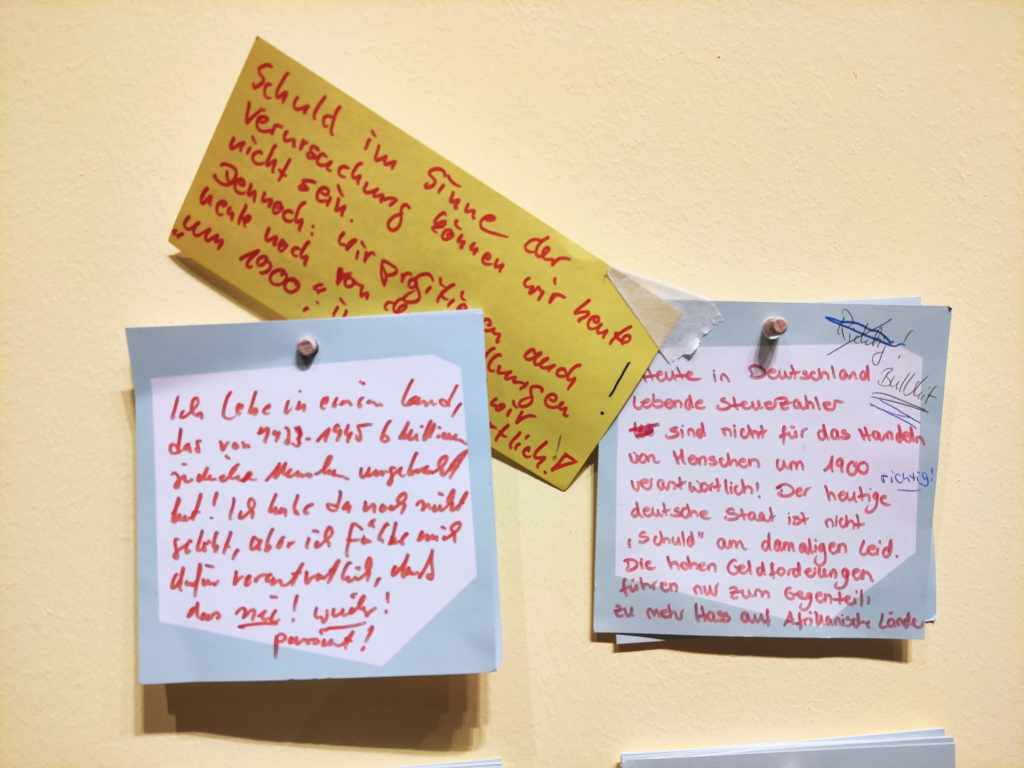 Doch der eigentliche Fokus lag nicht auf den ausgestellten Objekten, sondern dem Wust aus all den Post-Its und Anmerkungen, die die Besuchenden überall in der Ausstellung angebracht hatten. Das Konzept ist spannend und neu. Mal waren konstruktive Erweiterungen zu lesen, so zum Beispiel weitere Orte mit kolonialem Hintergrund in der Region, denen sich die Kuratorinnen noch nicht bewusst waren. Mal waren es allgemeine Ideen, Meinungen oder Gedanken zum Kolonialismus und der Ausstellung. So zum Beispiel wünsche, welche Themen vertieft in der finalen Ausstellung behandelt werden sollten und wie diese erzählt werden könnten.