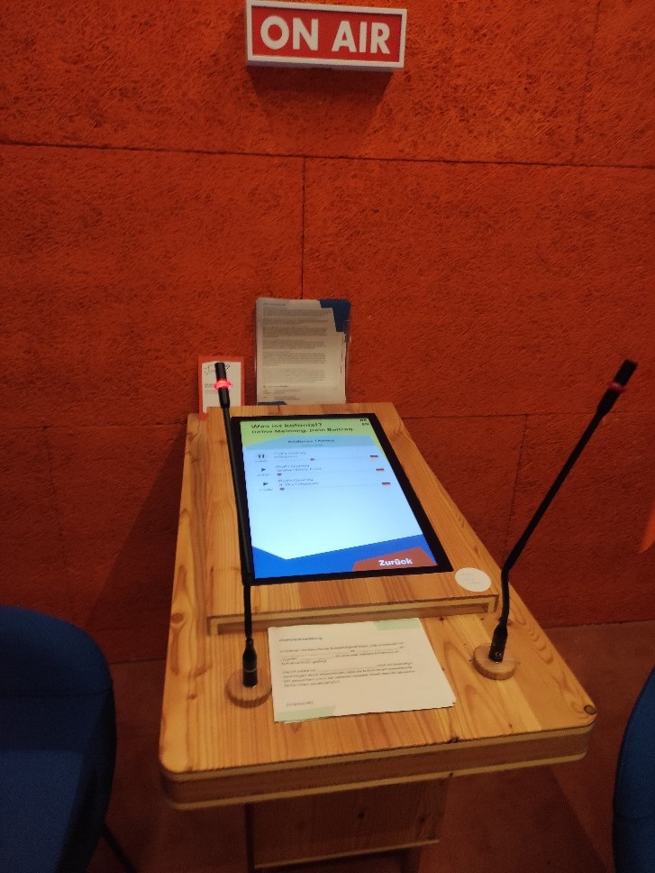 Ein weiterer Clou der Ausstellung war das Aufnahmestudio. In einem schallisolierten Raum befanden sich Mikrofone und ein Touchscreen, an dem sich Besuchende verbal zu Wort melden können, um ihre Geschichte zu erzählen. Dabei sind bestimmte Leitfragen und Themen vorgeschlagen, an denen sich die Besuchenden orientieren konnten. Die Aufnahmen wurden gesammelt, kuratiert und konnten dann von anderen Besuchenden angehört werden. Hier waren einige interessante Wortbeiträge, auch in gesungener Form und fremden Sprachen zu hören.