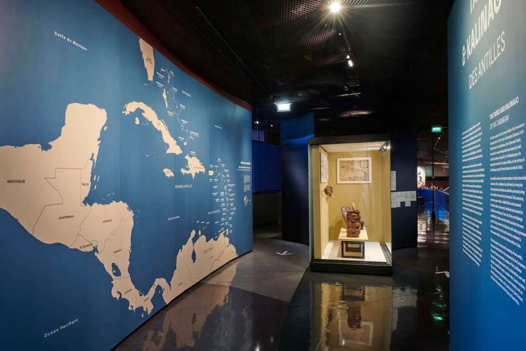 Es folgt ein Video, das den Ursprung der Taino und Kalinago im Orinoco-Delta an der heutigen Küste Venezuelas erläutert und die sukzessive Besiedelung der Karibik durch seine ersten Bewohner zeigt. In den folgenden Vitrinen werden die Exponate thematisch geordnet präsentiert, Texte erklären die Gegenstände, wobei die Objekttexte ausschließlich auf Französisch sind. Die Architektur der Ausstellung führt uns den einen Weg hinein bis ans Ende der Plateauebene, an dem uns Höhlenmalereien auf zwei groß aufgezogene Fotografien erwarten.