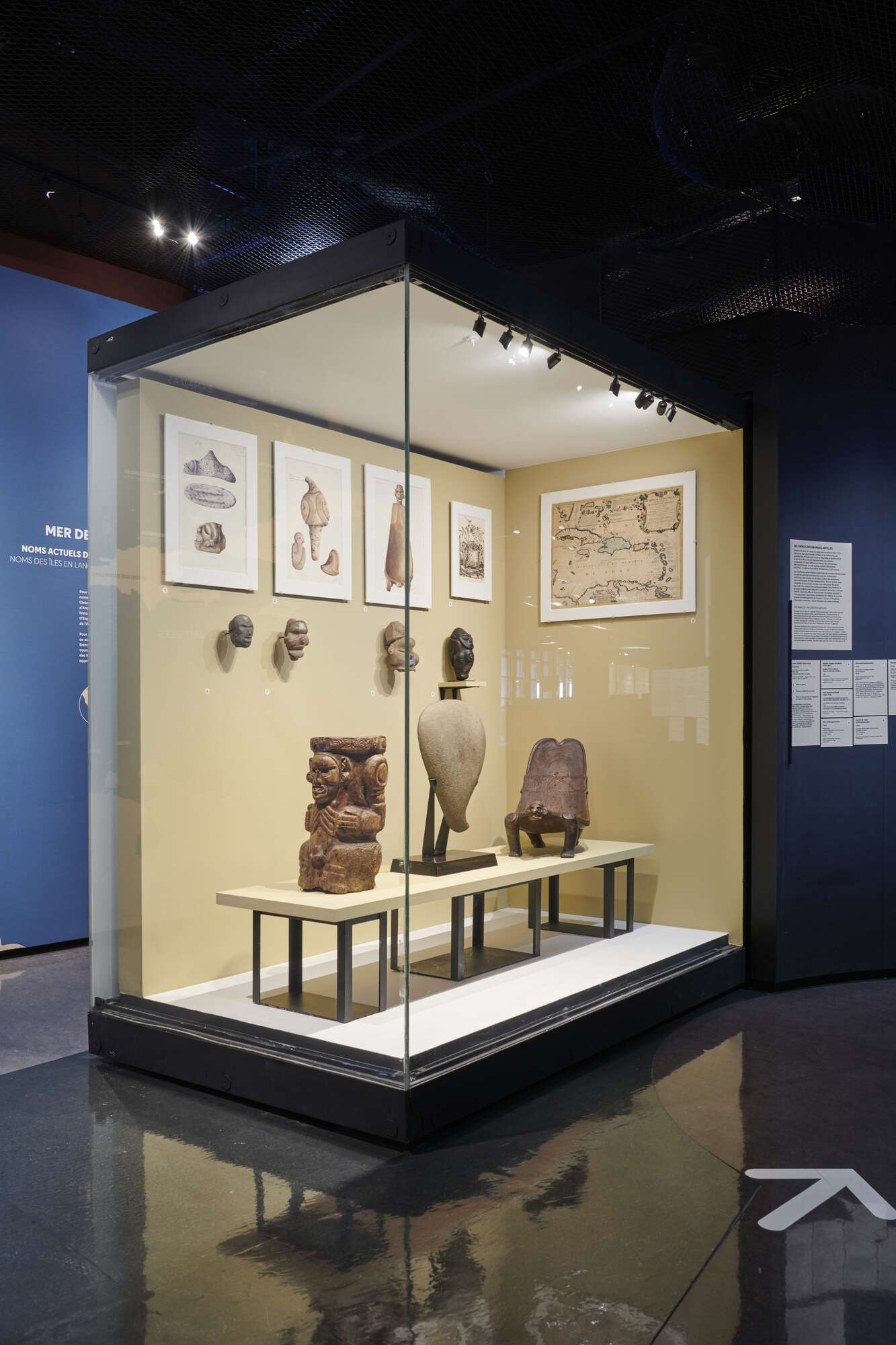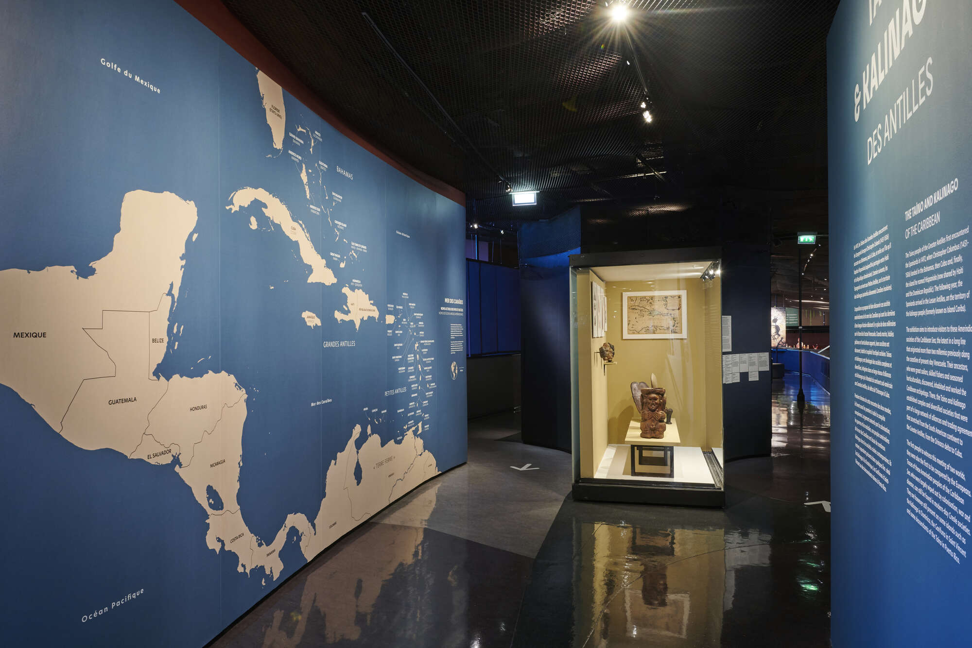 Es folgt ein Video, das den Ursprung der Taino und Kalinago im Orinoco-Delta an der heutigen Küste Venezuelas erläutert und die sukzessive Besiedelung der Karibik durch seine ersten Bewohner zeigt. In den folgenden Vitrinen werden die Exponate thematisch geordnet präsentiert, Texte erklären die Gegenstände, wobei die Objekttexte ausschließlich auf Französisch sind. Die Architektur der Ausstellung führt uns den einen Weg hinein bis ans Ende der Plateauebene, an dem uns Höhlenmalereien auf zwei groß aufgezogene Fotografien erwarten.