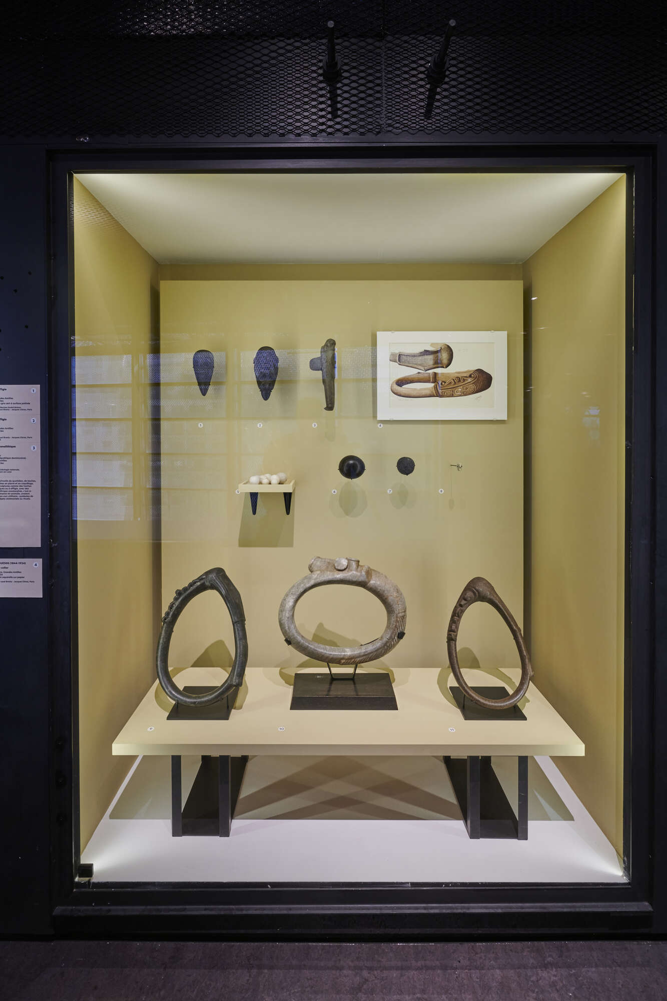 Zwei Taino-Rituale sind die eigentlichen Hauptpunkte dieser Ausstellung und es steht zu vermuten, dass sie es wohl auch vor dreißig Jahren waren. Zum einen das Ballspiel, „batey“, das jedoch weiterhin mehr Fragen aufgibt, als Antworten bietet. Die Präsentation in der Vitrine kann denn auch nur mit rätselhaften steinernen Ringen (sog. Halsketten) und Kugeln nebst einer Zeichnung des 19. Jahrhunderts aufwarten, aber bringt auch im Text keinerlei weitere Information über die Art des Spiels. Zum Beispiel fehlt die Information, dass es ohne Verwendung von Händen und Füßen gespielt wurde und damit so gar nicht den westlichen Ballspielen ähnelte.