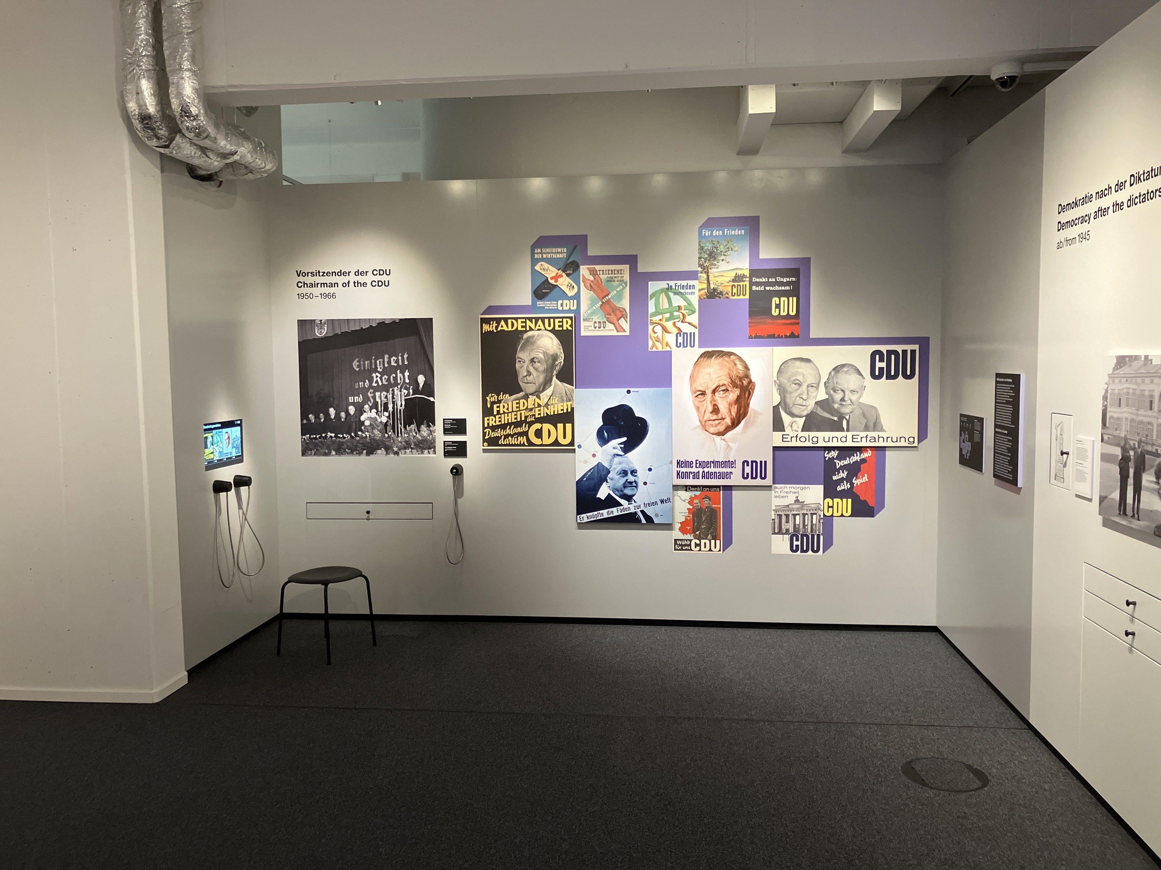 Es folgt chronologisch die Mitwirkung Adenauers am Wiederaufbau der Demokratie nach der Befreiung, bevor am Ende des Ganges eine Collage aus bundesrepublikanischen Wahlkampfplakaten mit dem Konterfei der Hauptperson die Blicke anzieht.