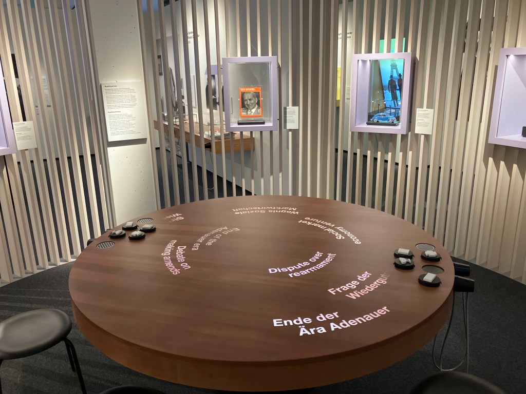 Ein großer, runder Tisch aus edlem Holz entpuppt sich als interaktive Installation, bei der verschiedene Themen ausgewählt und vertieft werden können. Eine Lamellenwand rahmt den Bereich halbrund ein und trägt vier Vitrinen, in denen Gegenstände auf die zentralen Konfliktherde und Debatten der „Adenauerzeit“ verweisen.