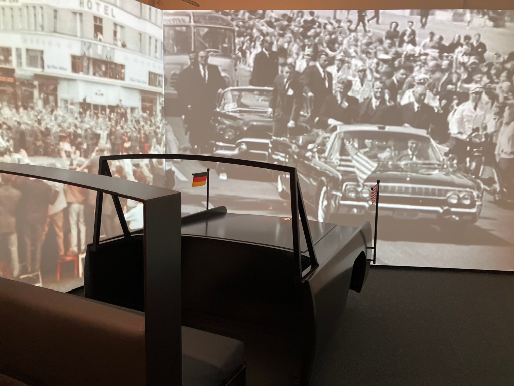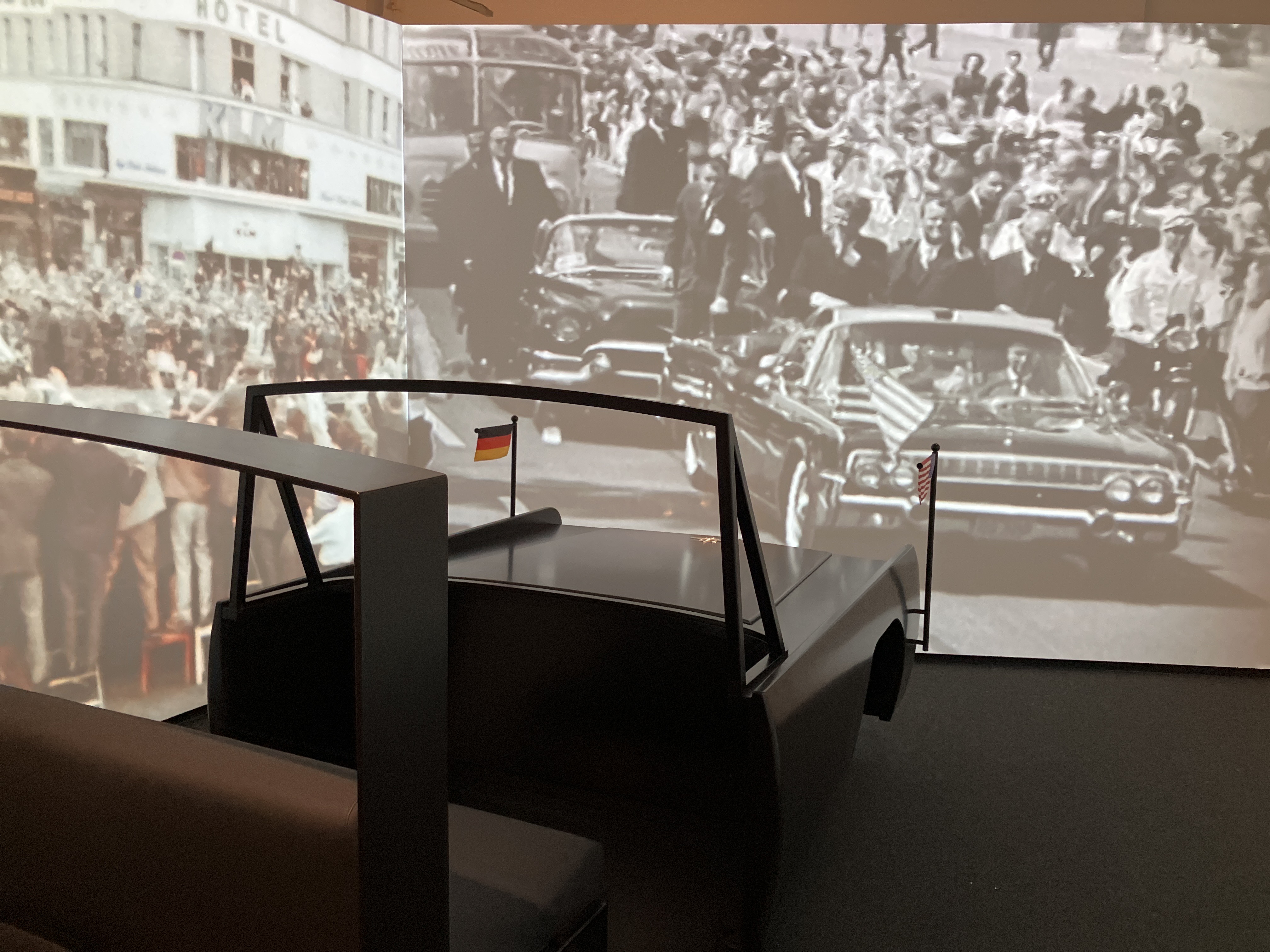 Den gestalterischen Höhepunkt dieses Bereichs und wohl auch der Ausstellung insgesamt bildet der Besuch des US-Präsidenten John F. Kennedy in Berlin im Juni 1963, knapp zwei Jahre nach dem Mauerbau. Ein ganzer Raum widmet sich diesem Ereignis und seiner medialen Inszenierung. Im Zentrum steht ein begehbares Objekt, das an die schwarze, offene Limousine erinnert, in der Kennedy und Adenauer durch die jubelnde Menschenmenge zum Brandenburger Tor fuhren. An drei der vier Wände laufen zeitgenössische Filmaufnahmen im Großformat, die vierte Wand füllt ein Großfotos, das den Fahrzeugkonvoi und im Hintergrund die Siegessäule zeigt. Die Originaltöne bringen die Begeisterung entlang des Fahrweges eindrucksvoll zur Geltung.