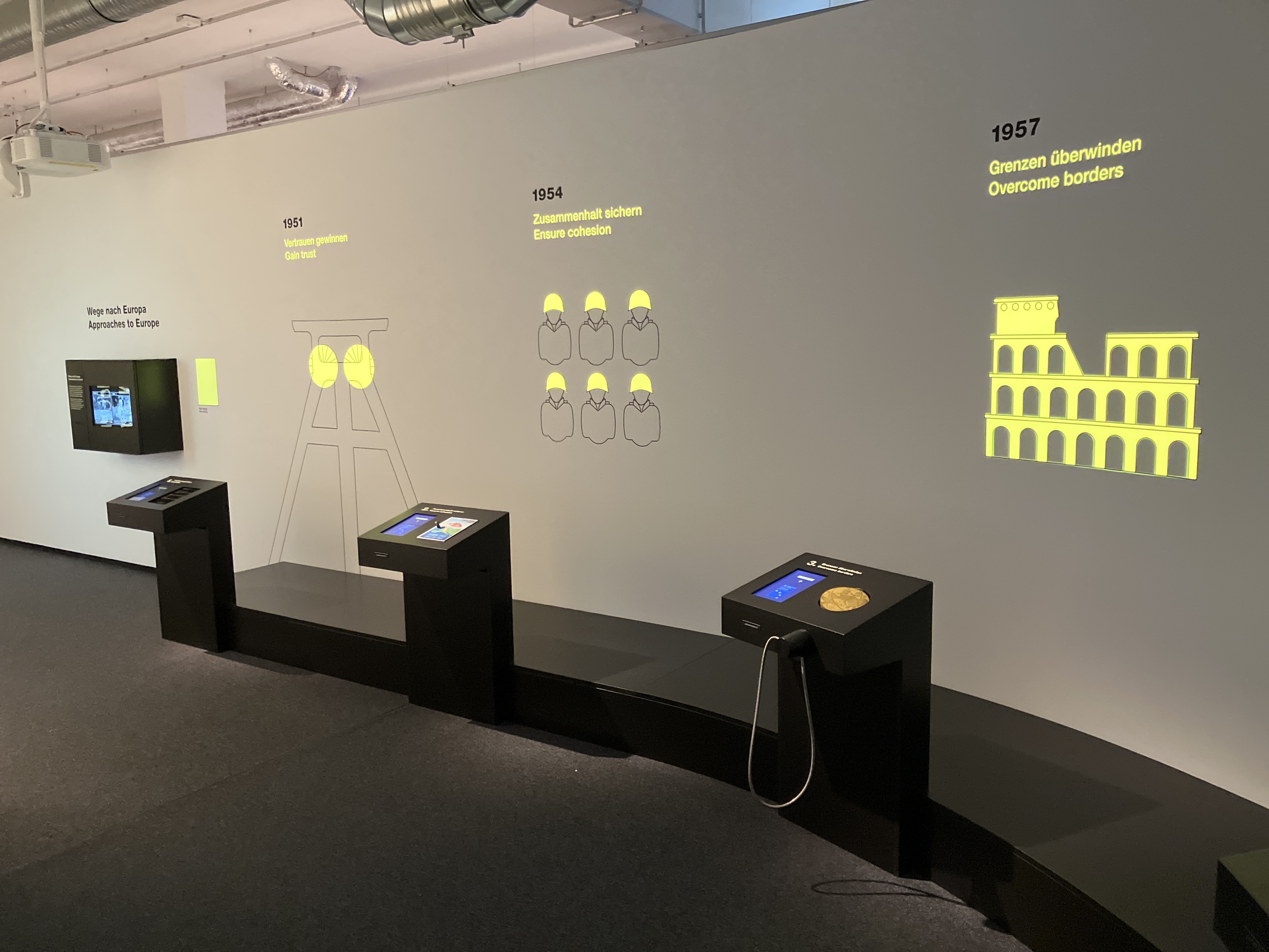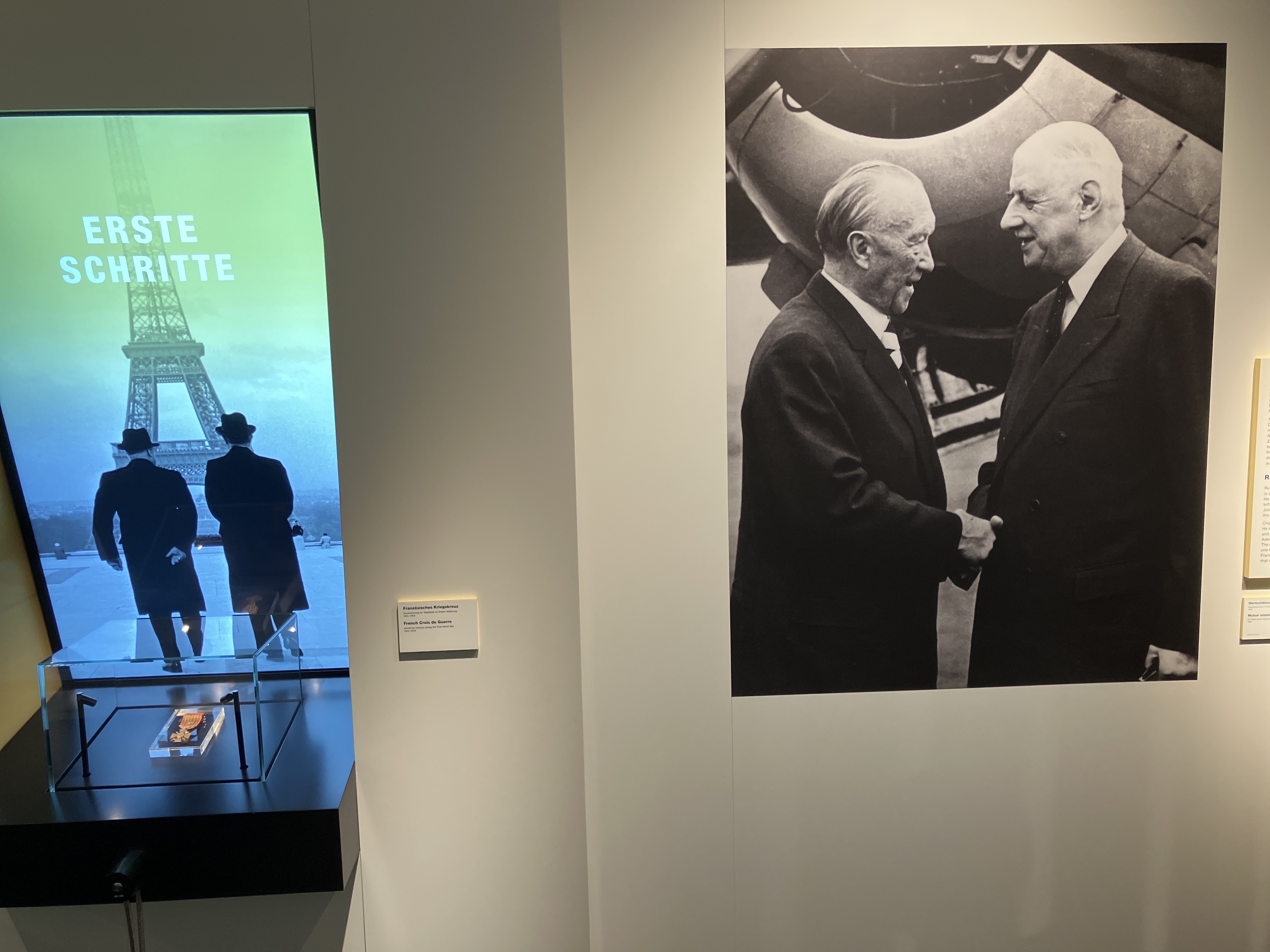 Die Überschrift „Europa“ markiert den dritten Teil der Ausstellung, der sich mit der Pastellfarbe Gelb heraushebt. Hier stehen die Aussöhnung mit Frankreich unter Präsident Charles de Gaulle und die ersten europäischen Verträge von 1951 und 1957 im Mittelpunkt. Die zeitgenössische mediale Inszenierung der beiden ‚großen Männer‘ und die symbolträchtige Aufladung ihrer Begegnungen und Vertragsabschlüsse liefert mehr als genug Material für die Ausstellungsgestaltung.
