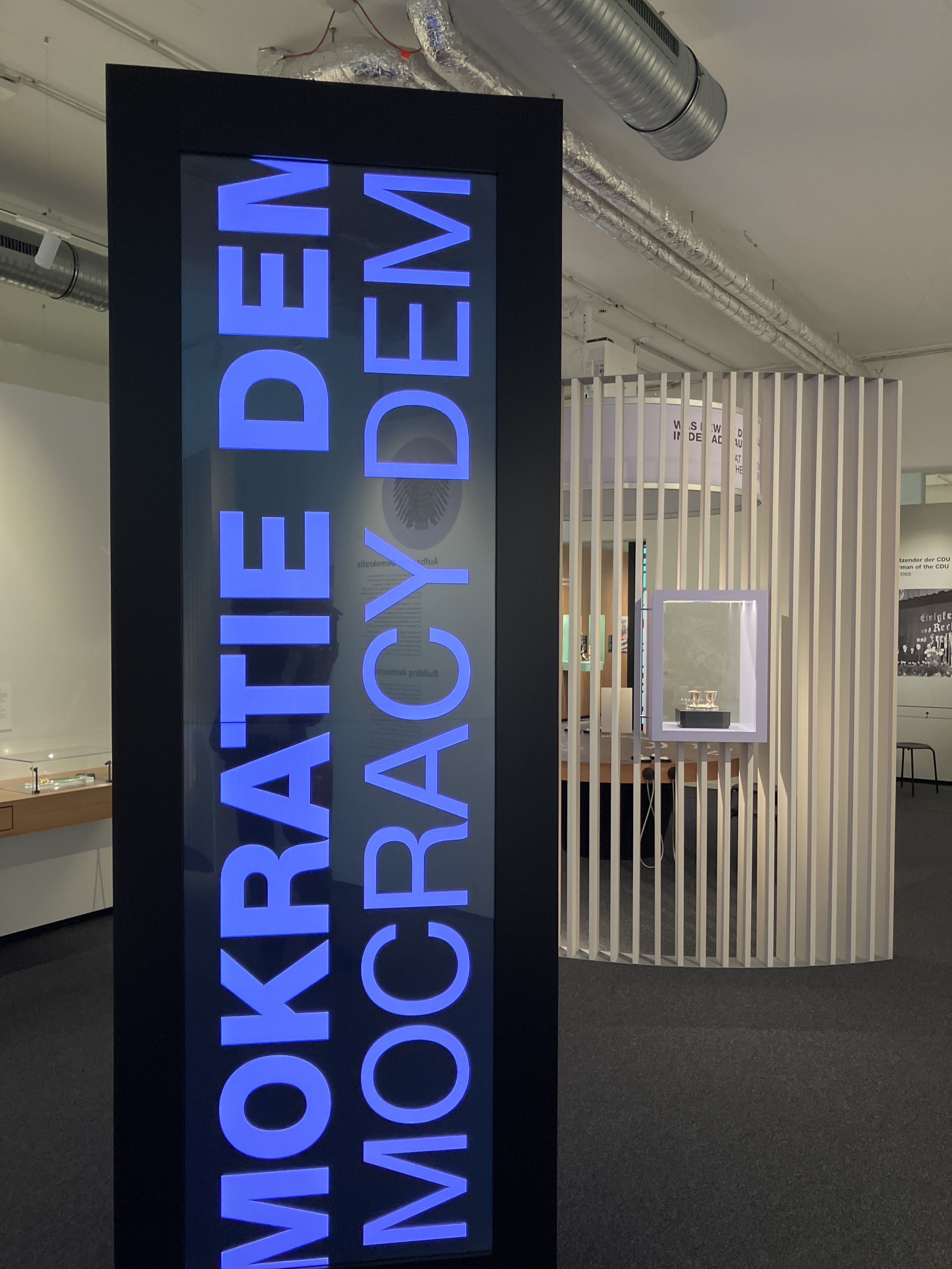 Dazu trägt auch bei, dass das jeweilige Thema des Bereichs an einer beleuchteten raumhohen Stele zu lesen ist. Den Auftakt bildet die „Demokratie“. Dort bieten sich auch Interaktionsmöglichkeiten, zum Beispiel die Frage, welche Werte die Demokratie vor allem verteidigen soll. Die eigene Auswahl wird dann den Mehrheitsverhältnissen im übrigen Ausstellungspublikum gegenüber gestellt.