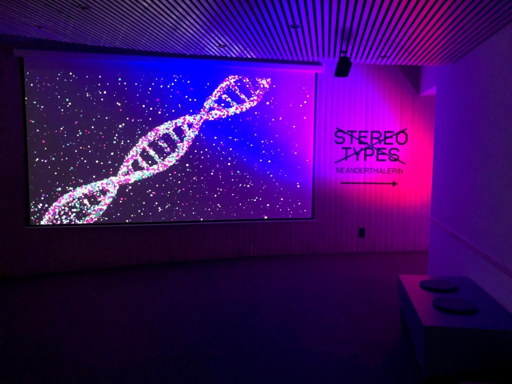 Zu Beginn betritt man einen abgedunkelten Raum und steht vor einem großen Bildschirm. Hier ahmen Neanderthaler*innen die Körperbewegungen des Besuchenden nach – ein interaktives Highlight, das zum Mitmachen anregt und eine überraschende Nähe zu unseren entfernten Vorfahren herstellt.