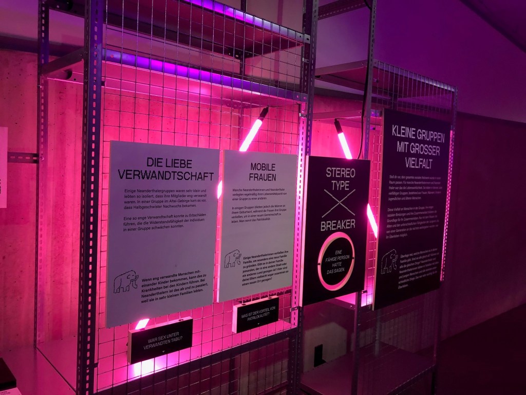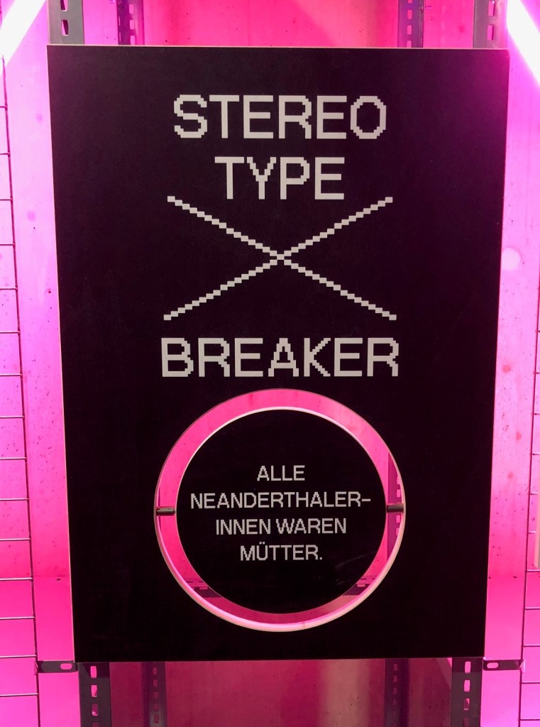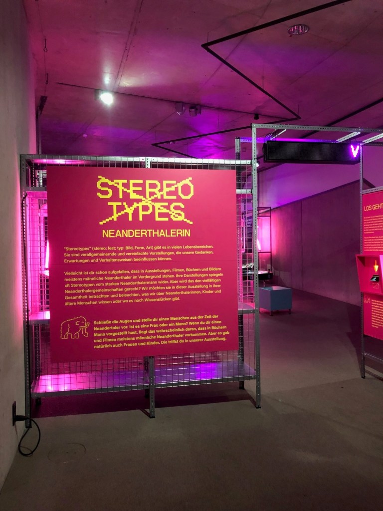 Trotz vieler positiver Aspekte gibt es aus meiner Sicht einige Punkte, die die Ausstellung noch weiter verbessern könnten. Ein zentraler Kritikpunkt ist der teilweise verstärkte Dualismus der Geschlechter, der in der Ausstellung mitschwingt. Obwohl viele Fragen aufgeworfen und selten definitive Aussagen gemacht werden, könnte die konsequente Unterteilung in „männlich“ und „weiblich“ die Diskussion über die Geschlechterkonzeption der Neanderthalerinnen vereinfachen. Hatten sie überhaupt eine klare Vorstellung von Geschlecht im modernen Sinne? Hier wäre mehr Raum für eine differenziertere Auseinandersetzung mit den sozialen und biologischen Rollen der Neanderthalerinnen möglich. Auch die Wahl einer eher stereotypen pinken Farbgestaltung könnte als problematisch angesehen werden, da sie die veralteten Geschlechterstereotype, die eigentlich hinterfragt werden sollen, eher verstärkt als aufbricht.