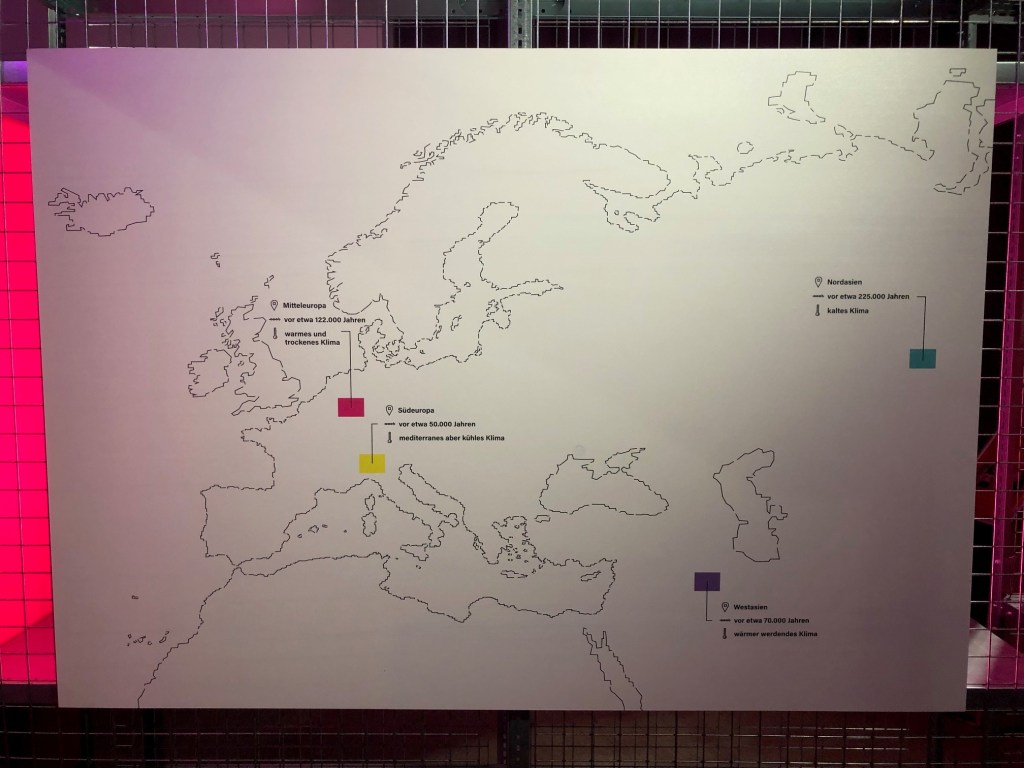 Schon beim Betreten der Ausstellung geht’s direkt los: Man zieht eine „Charakterkarte“ und wird einer von vier Neandertalerinnen zugeordnet. Auf einer Weltkarte ist nachzuvollziehen, wann und wo die Neanderthalerin lebte und welches Klima damals herrschte – alles per farbiger Zuordnung. Mithilfe der an der Kasse erhaltenen Kopfhörer begleitet man diese Neanderthalerin nun auf einer spannenden Audiotour, geschrieben von der Archäologin und Bestsellerautorin Rebecca Wragg Sykes, durch die Ausstellung. Es wird kein trockener Faktenmarathon, sondern ein lebendiger Einblick in das Leben einer anderen Zeit – ein ganz persönliches Abenteuer in die Vergangenheit. Am Ende der Ausstellung kann man die Charakterkarte stempeln und als Souvenir mitnehmen.