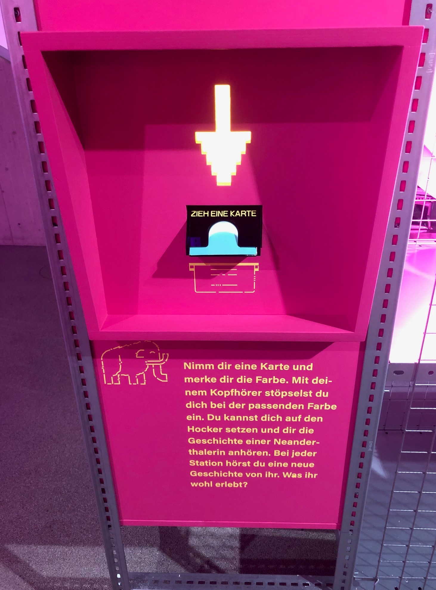 Schon beim Betreten der Ausstellung geht’s direkt los: Man zieht eine „Charakterkarte“ und wird einer von vier Neandertalerinnen zugeordnet. Auf einer Weltkarte ist nachzuvollziehen, wann und wo die Neanderthalerin lebte und welches Klima damals herrschte – alles per farbiger Zuordnung. Mithilfe der an der Kasse erhaltenen Kopfhörer begleitet man diese Neanderthalerin nun auf einer spannenden Audiotour, geschrieben von der Archäologin und Bestsellerautorin Rebecca Wragg Sykes, durch die Ausstellung. Es wird kein trockener Faktenmarathon, sondern ein lebendiger Einblick in das Leben einer anderen Zeit – ein ganz persönliches Abenteuer in die Vergangenheit. Am Ende der Ausstellung kann man die Charakterkarte stempeln und als Souvenir mitnehmen.