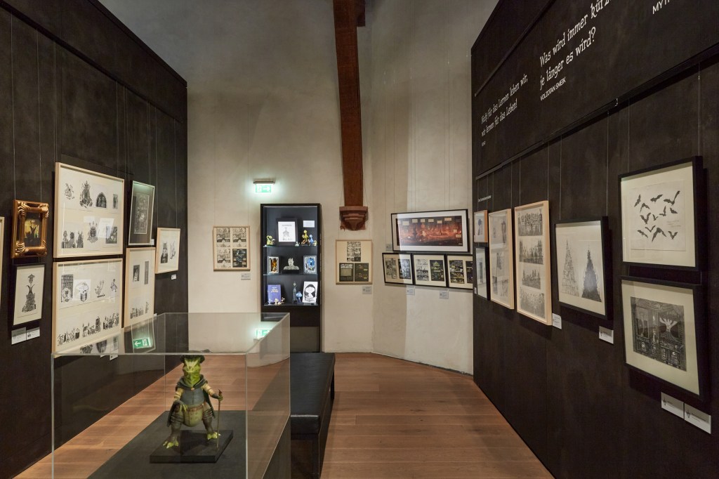 Dabei liegt der Fokus klar auf der Flachware: handgezeichnete Illustrationen und Comicstrips dominieren das Bild. Ergänzt wird das Ganze durch dreidimensionale Figuren der Kreaturen aus Zamonien und kurze Animationsfilme, mit Szenen aus „Der Pinguin“ und „Adolf, die Nazi-Sau“, die Moers’ satirische Schärfe auf bewegten Bildern verdeutlichen.