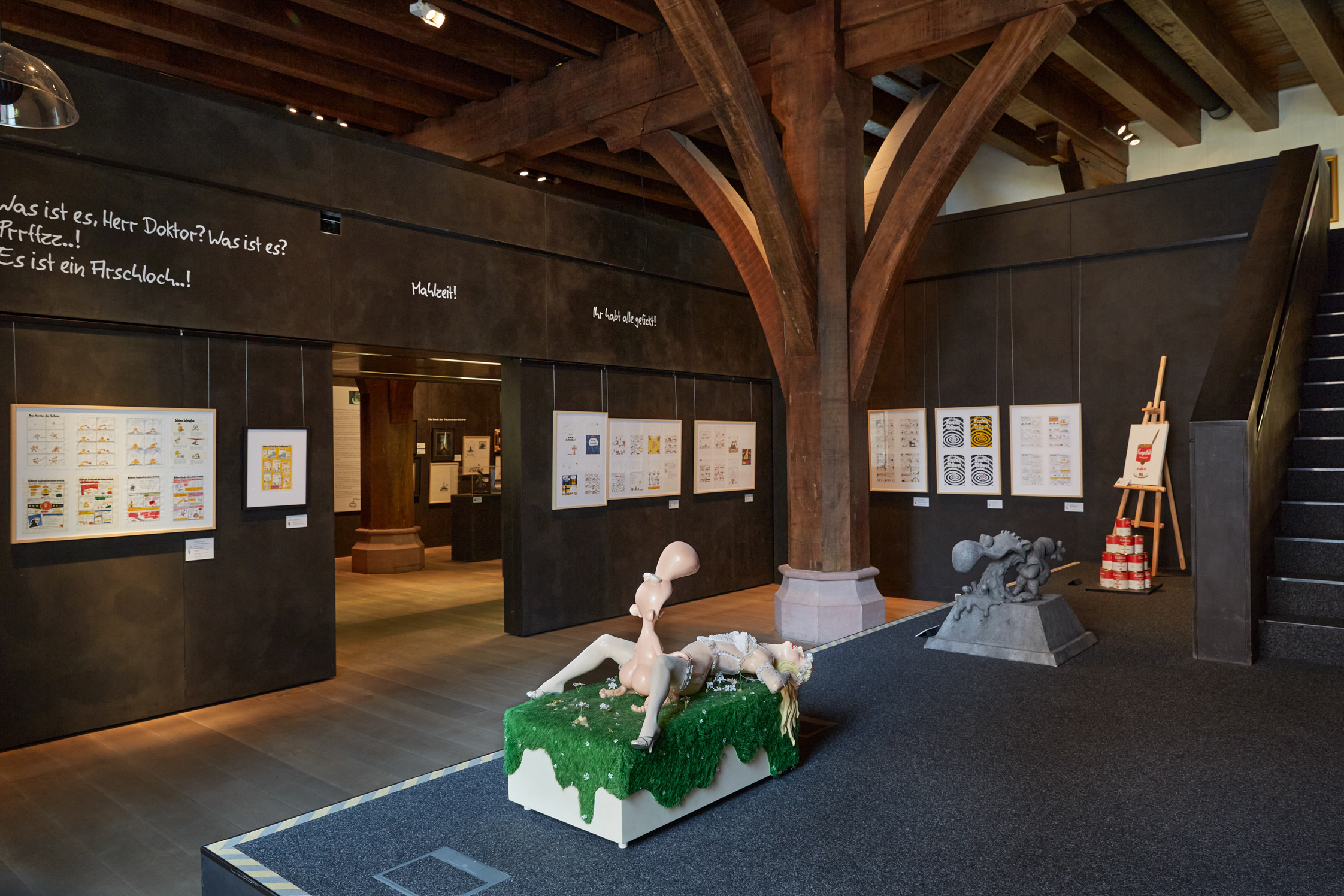 Schon vor dem Betreten des Museums erhascht man einen vielversprechenden Blick auf Moers Karikatur des berühmten Bildes von Roy Lichtenstein. Ein treffender Vorgeschmack für die restliche Ausstellung! Das Caricatura Museum ist kein großes Ausstellungshaus, doch die Präsentation nutzt den vorhandenen Raum geschickt. Im Zentrum stehen Originalzeichnungen, Skizzen und Comics von Moers, die seine künstlerische Entwicklung und seine Bandbreite sichtbar machen. Wer nur seine „13 ½ Leben des Käpt’n Blaubär“ kennt, wird überrascht sein, wie radikal und provokant seine frühen Comics in der TITANIC waren. Figuren wie das Kleine Arschloch oder Adolf, die Nazi-Sau sind politisch unkorrekt wie eh und je und beweisen, dass Moers nie vor Tabubrüchen zurückschreckte. Gleichzeitig nimmt die Ausstellung seine fantastische Seite ernst: Zamonien mit seinen skurrilen Kreaturen und dichten Erzählwelten ist ebenso vertreten.