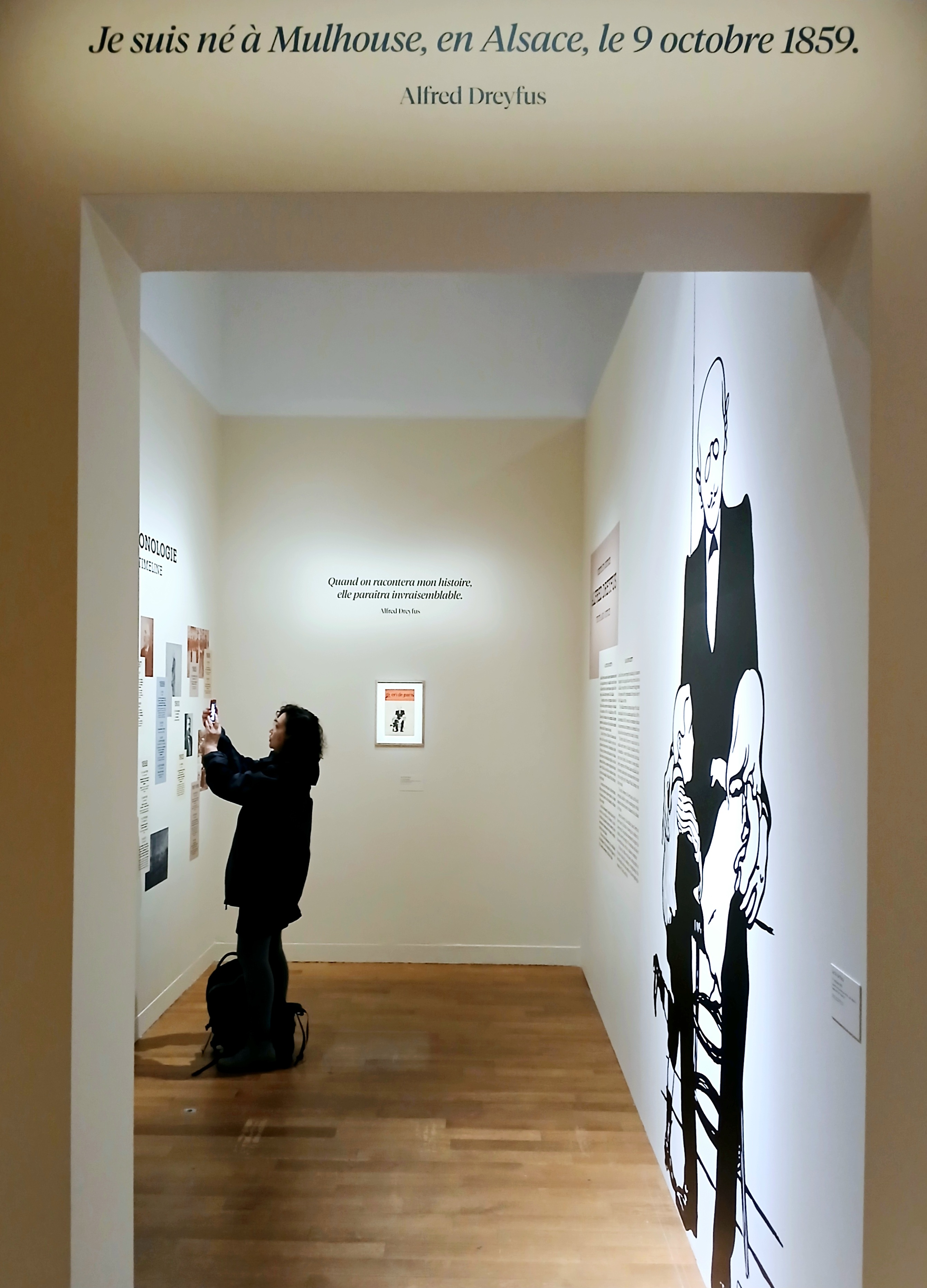 Am Beginn der Ausstellung steht groß aufgezogen die Karikatur Félix Vallottons, die einen Vater (Dreyfus) beim Geschichtenerzählen mit seinen Kindern zeigt sowie ein erstes Zitat von Dreyfus (s.o.). Von hier entfaltet sich diese „unglaubliche Geschichte“ in chronologischer Abfolge und führt durch die Stationen eines Lebens, das die dramatische Wendung nahm. Bevor die Ausstellung die Etappen des Skandals, den unermüdlichen Kampf um Gerechtigkeit und die langen Nachwehen abhandelt, wird der Mensch dahinter gezeigt: der Sohn, Schüler, Ehemann, zufriedene Vater und stolzer Militär.
