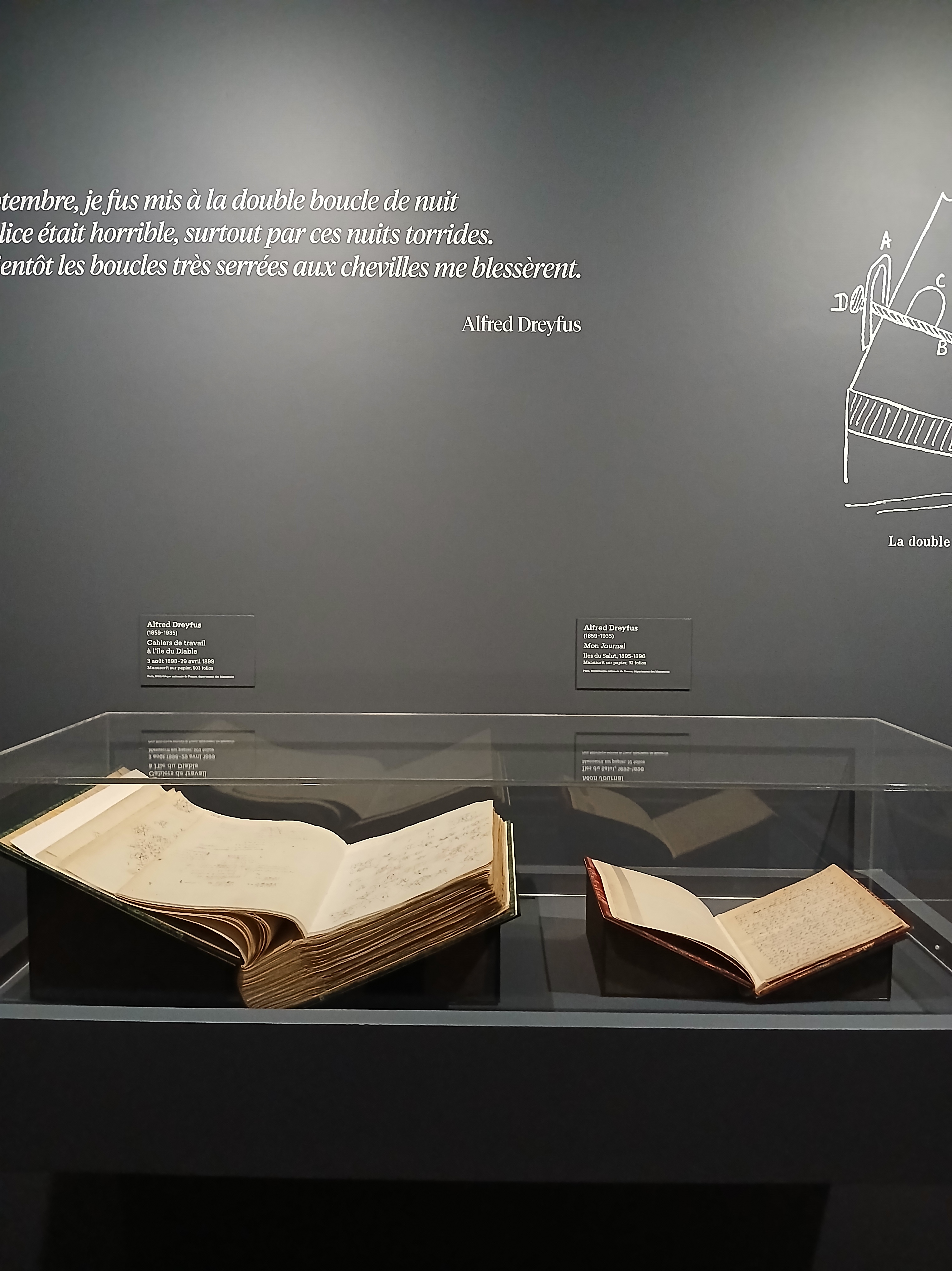 Das zeigt sich insbesondere in der kleinen Sektion zu seinen Jahren im höllischen Straflager in Übersee, passend in Meeresblau hinterlegt und mit der Projektion von Wellenbewegungen. Das verleiht der Sektion ausgerechnet jene friedliche Atmosphäre, die er keinesfalls erlebte. Sein schmales Tagebuch, das Alfred Dreyfus zwischen 1895 und 1896 führte, wird aufgeklappt in einer Vitrine neben seinen Cahiers de travail d‘ Île du Diable präsentiert. Auf diese Art erfahren wir jedoch zu wenig, was der Gepeinigte selbst festzuhalten wusste. Hier hätte schon ein nebenstehendes Transkript geholfen. Insgesamt wünschte ich mir endlich eine innovativere Präsentationsform von Büchern, die mit den medialen Mitteln von heute möglich ist.