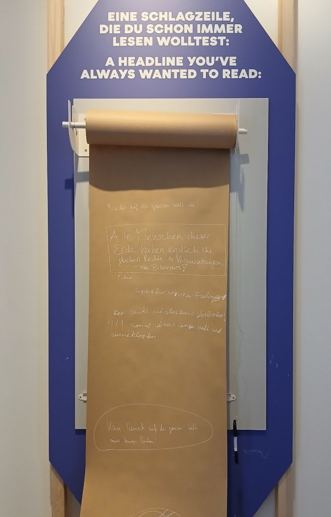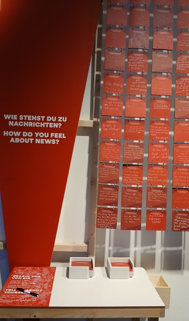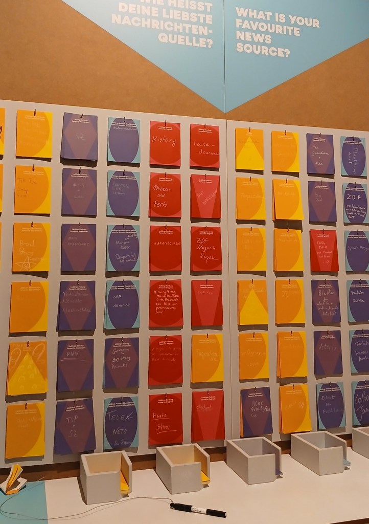 Die Wand mit Antworten von Besucher:innen zur Frage, welche Nachrichtenquelle die bevorzugte sei, gibt einen repräsentativen Einblick in den zeitgenössischen Mediengebrauch: Immer häufiger erhält man seine Nachrichten nicht mehr durch traditionelle Formate und Produzenten, sondern als User-Generated Content von Podcasts und Social Media-Persönlichkeiten. Welchen Einfluss hat diese Form des Nachrichtenkonsums in Zukunft?
