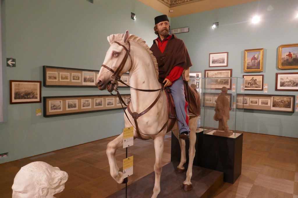 Die auf den dritten Saal folgenden 26 Räume, die in farblich voneinander abgegrenzte thematische Sektionen gegliedert sind, erzählen in weitgehend chronologischer Reihenfolge die Geschichte eines „langen“ Risorgimento von der Französischen Revolution bis zum Ersten Weltkrieg. Dass unter Historikern kein eindeutiger Konsens über die genauen Epochengrenzen besteht, wird hierbei nicht erwähnt. Positiv hervorzuheben ist, dass das Museum die italienische Nationalgeschichte in ihren transnationalen Bezügen darstellt: Der europäische Kontext wird immer wieder berücksichtigt, wenn es etwa um die Französische Revolution und ihre „Schwesterrepubliken“, Europa unter napoleonischer Besatzung, die französische Julirevolution von 1830, die Revolutionen von 1848 oder das bürgerliche Leben in Europa 1870–1915 geht. Auch die Probleme des jungen Nationalstaats wie der Bürgerkrieg im Süden gegen die sogenannten Briganten oder die „Römische Frage“ – Rom gehörte 1861, zum Zeitpunkt der italienischen Nationalstaatsgründung noch zum Kirchenstaat und wurde erst 1870/71 vom Königreich Italien annektiert – werden nicht ausgeblendet. Die Dauerausstellung behandelt sowohl die demokratischen als auch die moderaten und konservativen Kräfte des Risorgimento: So ist der achte Raum nicht nur der „Restauration“ gewidmet – ein Begriff, den man vor dem Hintergrund der aktuellen historischen Forschung vielleicht stärker hätte problematisieren können. Er behandelt auch die Geheimgesellschaften, unter denen die Carboneria anfangs die führende Stellung einnahm, und die frühen Revolutionen der 1820er-Jahre. Mit einer Büste des Revolutionärs Giuseppe Mazzini im Zentrum befasst sich der zehnte Raum eigens mit den Aufständen der 1830er-Jahre und der Rolle der demokratischen Bewegung. Der folgende Saal hat die liberalen Kräfte zum Gegenstand, die durch Reformen „von oben“ die nationale Einigung verwirklichen wollten. Ebenso werden weitere Protagonisten des Einigungsprozesses thematisiert. Der Guerillaführer Giuseppe Garibaldi taucht mit einer lebensgroßen Rekonstruktion zu Pferde in Raum 22 auf (s. Abb. 2). Auch der piemontesische Ministerpräsident Camillo Benso von Cavour und König Vittorio Emanuele II. (Raum 18) werden ausreichend gewürdigt.