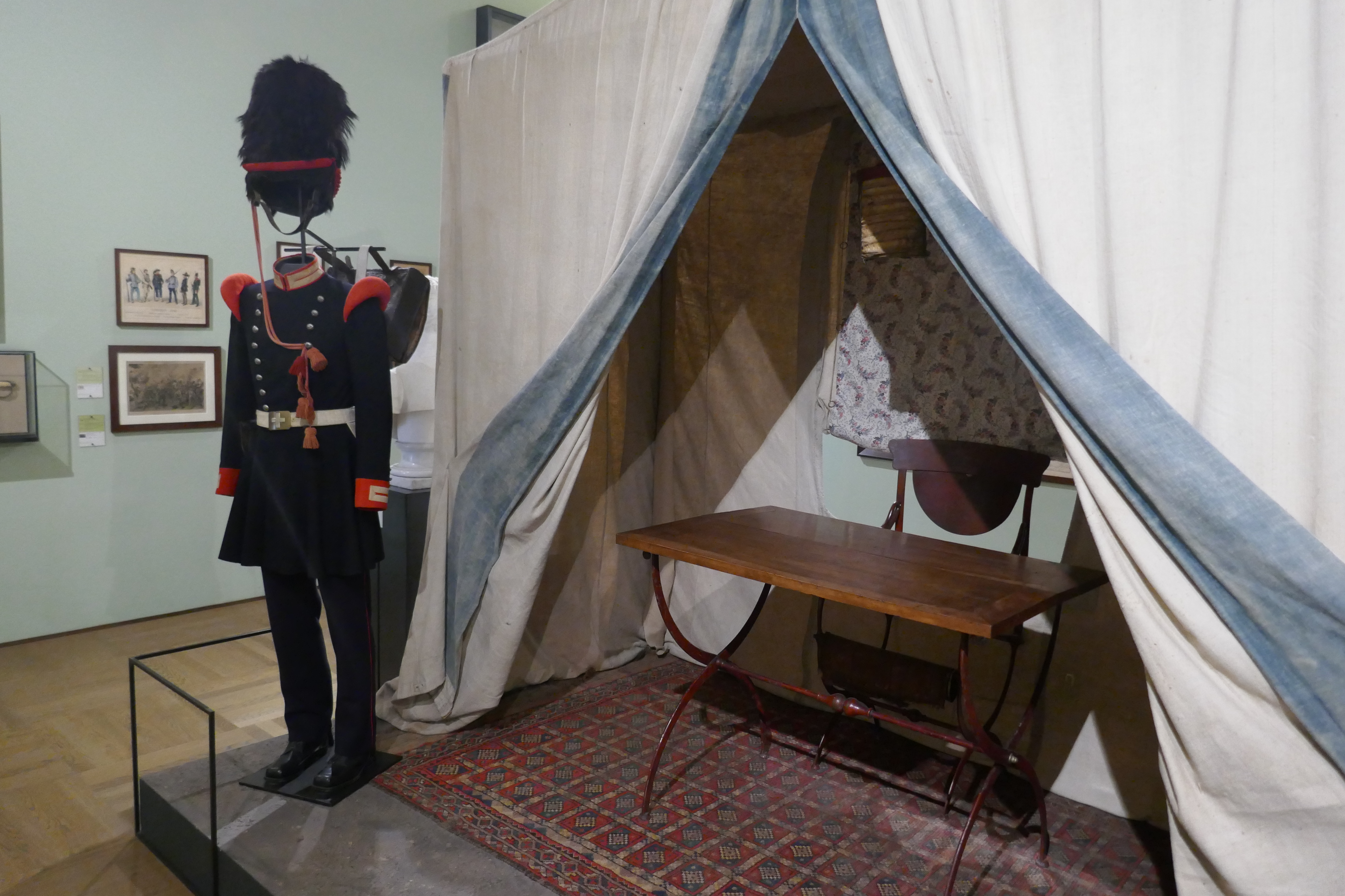 Saal 13 wird von einer gewaltigen österreichischen Druckpresse dominiert, welche die im März 1848 erkämpfte Pressefreiheit im Habsburgerreich symbolisiert. In Raum 14, der dem „Ersten Unabhängigkeitskrieg“ 1848–49 gewidmet ist, befindet sich das Feldzelt des piemontesischen Königs Carlo Alberto (s. Abb. 6).