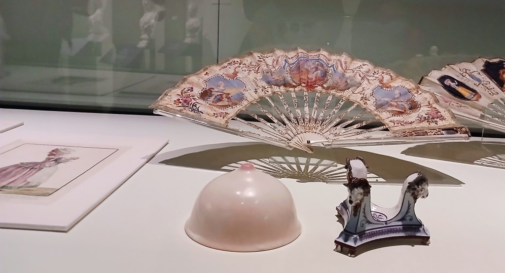 Es folgen in den weiteren Räumen viele schöne Nichtigkeiten, die Marie Antoinettes Tage und Nächte erfüllt haben: Schminktische und Sitzmöbel, Schmuckstücke, und noch viele mehr davon, handwerklich höchst qualitativer Tand, Krimskrams und Nippes, Kurioses wie eine auf dem antiken Mythos basierende „Nippelschale“, Spitze und Stoffdesigns, Fächer und Entwürfe für skulpturale Frisurenmonstrositäten, eine Ausgabe des damaligen Romanbestsellers Les liaisons dangereuse (1782), von dem sie nachweisbar eines besessen hatte, Schmähpamphlete der Abstiegsjahre und schließlich Mode, die nach ihr kam und von ihrem zeitlosen Stil inspiriert wurde.